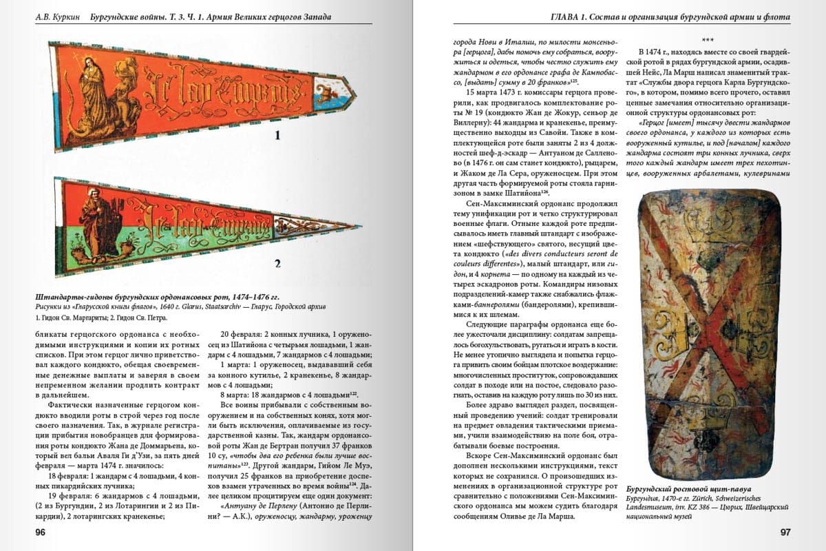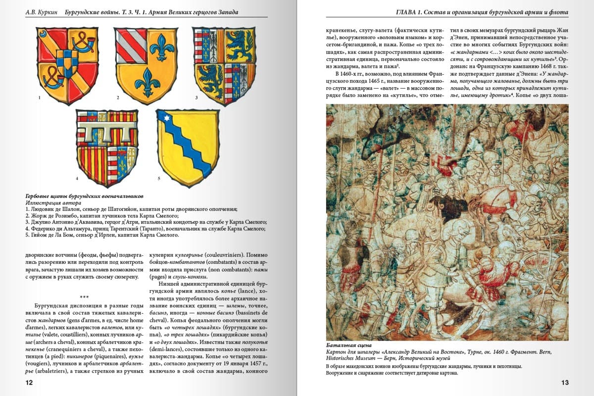 Эта книга посвящена вооруженным силам Бургундского государства, крупнейшего княжества Западной Европы XIV-XV вв. В первой части впервые на русском языке комплексно рассмотрены различные составляющие бургундской армии - феодальное ополчение, городская милиция, наемники, ордонансовые роты, гвардия… Рыцарская конница и жандармы ордонанса, лучники, пикинеры, арбалетчики, артиллеристы, инженерные части и флот - вот тот инструмент, которым бургундские герцоги или Великие князья Запада, как их называли, утверждали свою политическую волю на полях сражений. Богатейший иллюстративный ряд книги сочетается с многочисленными таблицами, схемами, фрагментами документов и военных уставов. Автор приводит биографии маршалов, капитанов, наемников и простых солдат. Почитатели микроистории найдут в тексте уникальные сведения о боевом пути тех или иных подразделений, включая поименные списки воинов. Кроме того, наряду с армией бургундских герцогов в книге освещаются вопросы, связанные с вооруженными силами Франции, Англии, Италии и Швейцарской конфедерации. Достаточно полная сохранность бургундских архивов позволяет документально проследить недолгую, но яркую историю армии бургундских герцогов династии Валуа. Обращение к документам помогает развеять романтический флер, которым окутано такое не вполне корректное понятие, как "рыцарское войско". Но что может быть полезней, чем избавление от иллюзий?