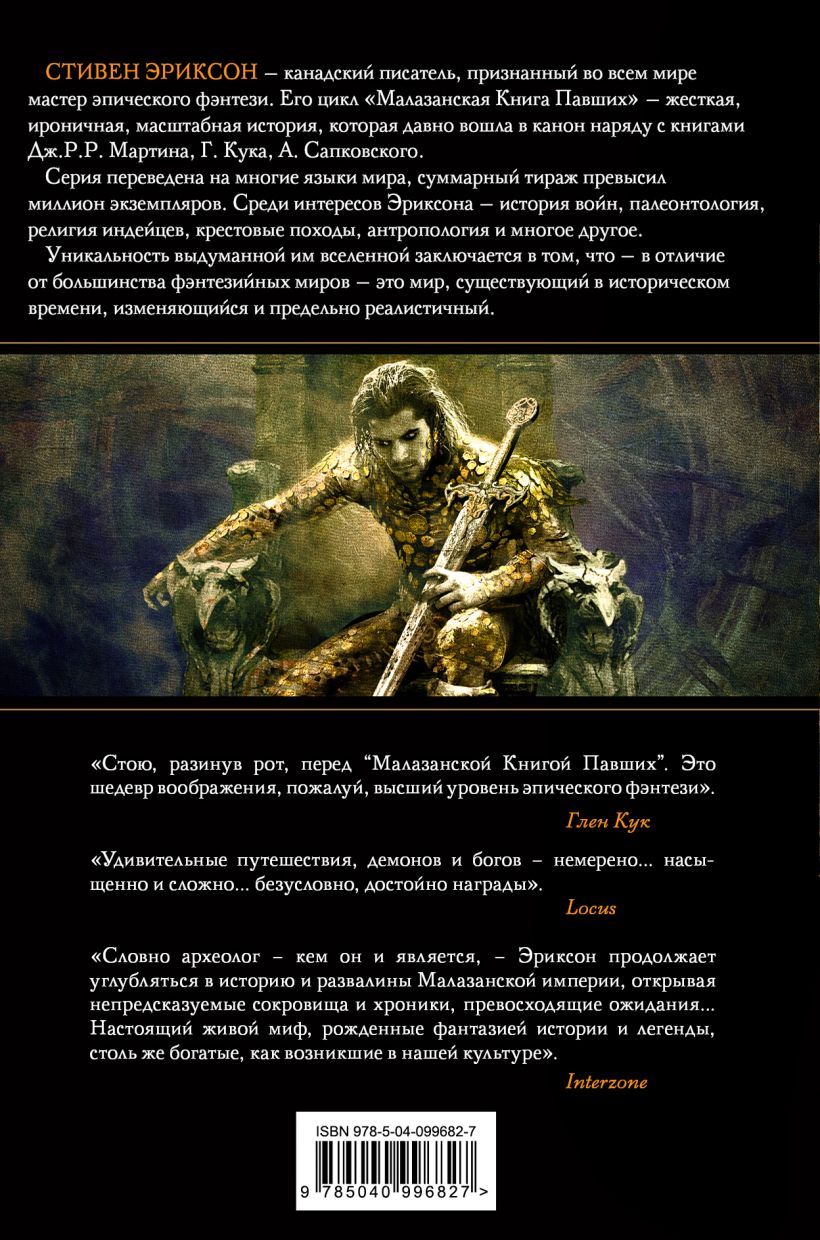 Великий флот эдур приближается к берегам древнего государства. Он несет бесчисленную армию со всех концов света. Среди них - два легендарных падших бойца, жаждущих скрестить мечи с проклятым Императором лично. Кровопролитие в таких масштабах не останется без ответа и может изменить судьбу мира. Брутальный роман о войне, интригах и темной, неконтролируемой магии. Самая захватывающая эпическая фэнтези, которую можно себе вообразить. Неспокойно в Летерийской империи. Рулад Сэнгар, Император Тысячи Смертей, попал под демоническую власть своего колдовского меча, который дарит ему бессмертие. Тайная полиция Патриотистов начинает чистки среди подданных. Пророки больше не могут видеть грядущее. Дворец полон заговорщиков, чиновники коррумпированы и ими движут только личные интересы. Старая Империя на грани войны с окружающими королевствами, которые не забыли давние обиды. Великий флот эдур приближается к берегам древнего государства. Он несет бесчисленную армию со всех концов света. Среди них - два легендарных падших бойца, жаждущих скрестить мечи с проклятым Императором лично. Кровопролитие в таких масштабах не останется без ответа и может изменить судьбу мира. Брутальный роман о войне, интригах и темной, неконтролируемой магии. Самая захватывающая эпическая фэнтези, которую можно себе вообразить.