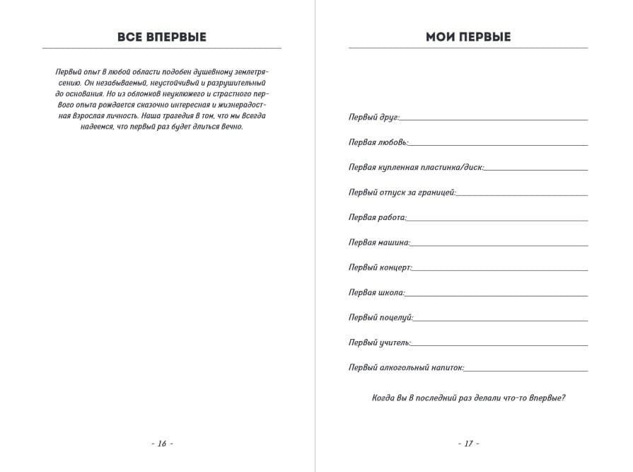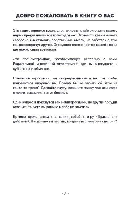 Насколько вы честны, когда на вас никто не смотрит? Становясь взрослыми, мы сосредотачиваемся на том, чтобы понравиться окружающим. Почему бы не забыть об этом на какое-то время? Ведь во время нестабильности и глобальных перемен, когда сил не хватает даже на базовые потребности, очень важно находить новые источники энергии. Этот блокнот – ваша уникальная возможность встретиться лицом к лицу с важными жизненными вопросами. Внутри вы найдете нетривиальные вопросы, интеллектуальные игры, мысленные эксперименты и домашние задания по самому важному предмету в мире – изучению самого себя. Изучайте себя в формате развлечения или со всей серьезностью — или чередуйте форматы в зависимости от вопроса. Возможно блокнот сможет заменить вам сеанс психотерапии. Возможно поможет разрешить какую-то сложную дилемму. Вы сами определяете, как далеко готовы зайти. Все зависит только от вас. Но самое важное – когда ответите на все вопросы, обязательно закопайте или спрячьте блокнот. Или… сожгите. Сожгите блокнот – а вместе с ним и свою боль. Помогите себе сами!
