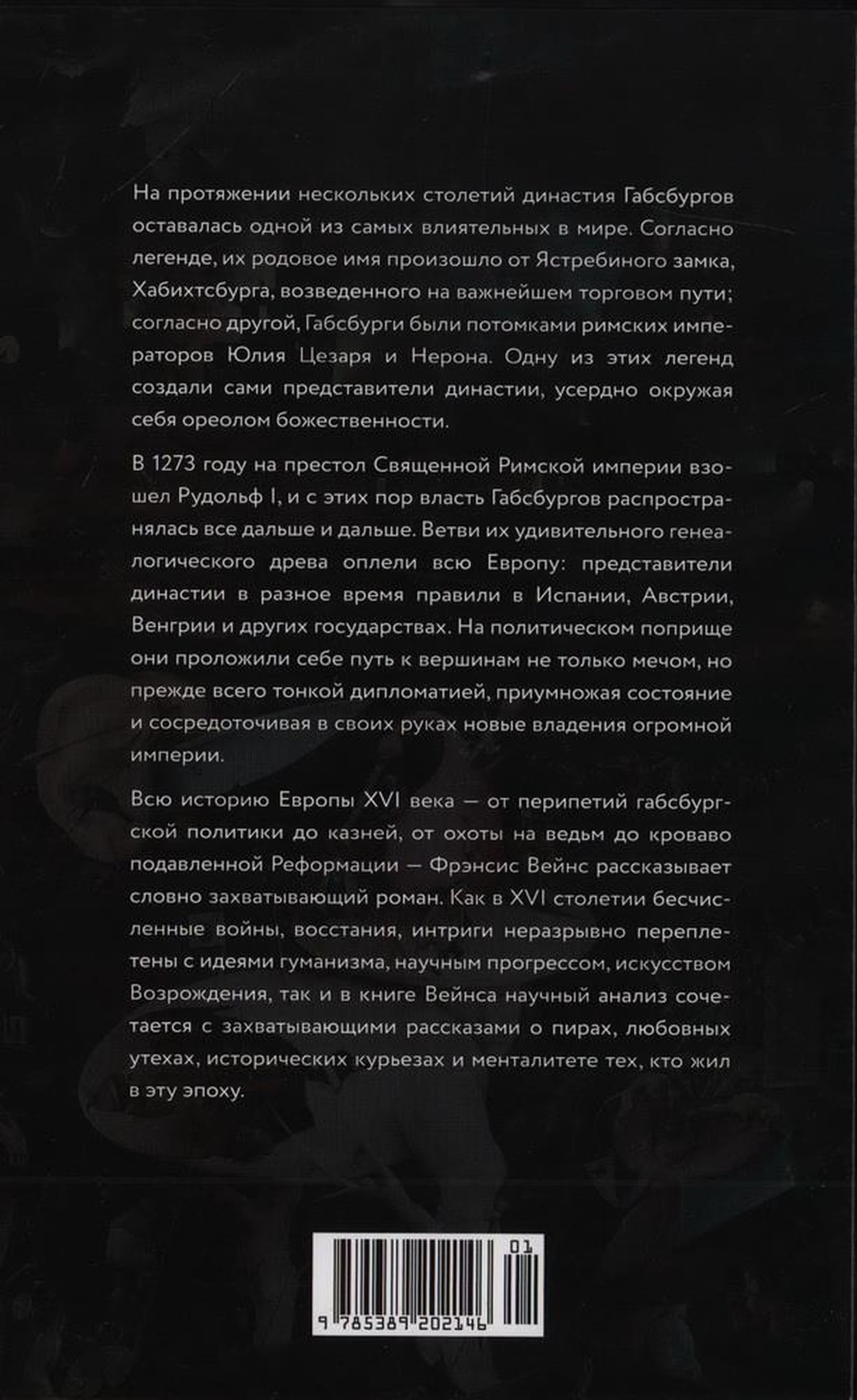 Книга известного историка Фрэнсиса Вейнса посвящена переломному периоду в европейской истории — необычайно долгому и насыщенному событиями XVI ве ку. Это важнейший рубеж, вобравший в себя черты и угасающего Средневековья с его охотой на ведьм, Реформацией, жестокими войнами, и Нового времени, эпохи перемен и научных открытий. Война следует за войной, в Европе вспыхивают восстания, ведьм сжигают на кострах. Османские войска вторгаются в Европу. Мартин Лютер пишет «95 тезисов», за что будет отлучен от церкви. Границы габсбургских владений пролегают так далеко, что затем их назовут империей, «над которой никогда не заходит солнце».