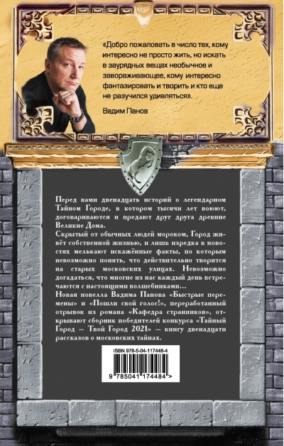 Перед вами двенадцать историй о легендарном Тайном Городе, в котором тысячи лет воюют, договариваются и предают друг друга древние Великие Дома. Скрытый от обычных людей мороком, Город живёт собственной жизнью и лишь изредка в новостях мелькают искажённые факты, по которым невозможно понять, что действительно творится на старых московских улицах. Невозможно догадаться, что многие из нас каждый день встречаются с настоящими волшебниками… Новая новелла Вадима Панова «Быстрые перемены» и «Пошли свой голос!» - переработанный отрывок из романа «Кафедра странников», открывают сборник победителей конкурса «Тайный Город – Твой Город 2021» - книгу двенадцати рассказов о московских тайнах.