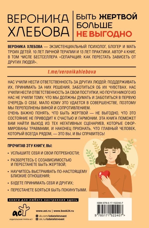 Нас учили нести ответственность за других людей: поддерживать их, принимать за них решения, заботиться об их чувствах. Нас учили нести ответственность за свои поступки, но почти никого из нас не учили тому, что мы должны думать и заботиться в первую очередь о себе. Мало кому это удается в совершенстве, поэтому мы переполнены виной и сопротивлением. Очень важно понять, что быть жертвой — не выгодно, что это состояние не приводит к счастью и гармонии. Книга «Быть жертвой больше не выгодно» поможет вам найти выход из тех негативных сценариев, которые сформированы травмами, и наконец признать, что главный человек, который всегда рядом, — это вы, и вы справитесь! Прочитав книгу «Быть жертвой больше не выгодно», вы: - услышите себя и свои потребности; - разберетесь с созависимостью и перестанете быть жертвой; - научитесь выстраивать по‑настоящему близкие отношения; - будете принимать себя и других; - перестанете бояться быть покинутыми.