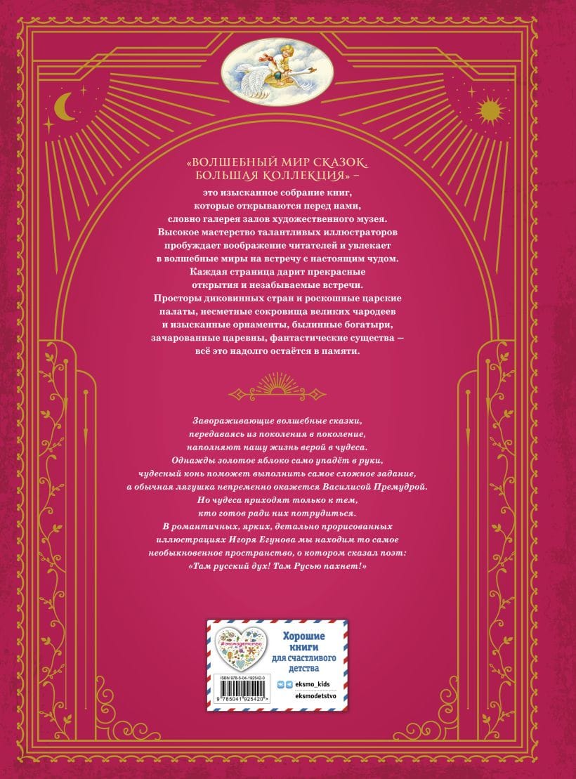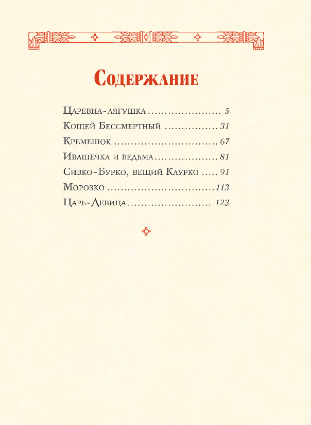В этой книге собрано шесть жемчужин из бесценного наследия устного народного творчества — волшебных русских сказок: «Царевна-лягушка», «Кощей Бессмертный», «Кремешок», «Ивашечка и ведьма», «Сивка-Бурка, вещий Каурко», «Морозко», «Царь-девица». Незабываемые, волнующие образы героев изящно и красочно воссоздал в своих иллюстрациях художник Игорь Егунов.
