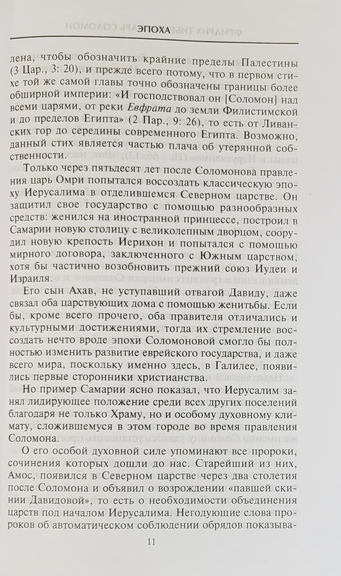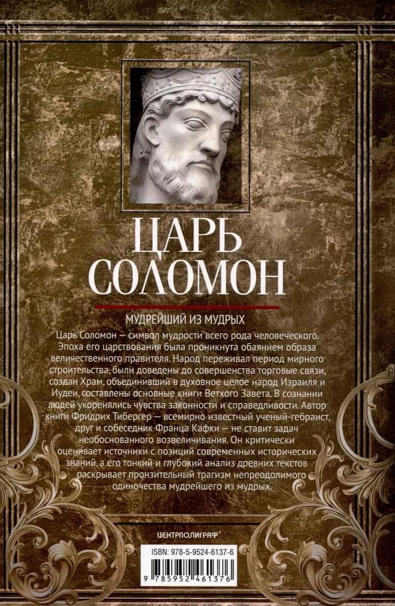 Царь Соломон, мудрейший из мудрых, — символ мудрости всего рода человеческого. Эпоха его царствования была проникнута обаянием образа величественного правителя. Народ переживал период мирного строительства, были доведены до совершенства торговые связи, создан Храм, объединивший в духовное целое народ Израиля и Иудеи, составлены основные книги Ветхого Завета. В сознании людей укоренялись чувства законности и справедливости. Автор книги Фридрих Тибергер — всемирно известный ученый-гебраист, друг и собеседник Франца Кафки — не ставит задач необоснованного возвеличивания. Он критически оценивает источники с позиций современных исторических знаний, а его тонкий и глубокий анализ древних текстов раскрывает пронзительный трагизм непреодолимого одиночества мудрейшего из мудрых.
