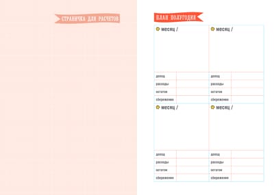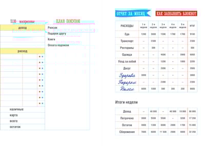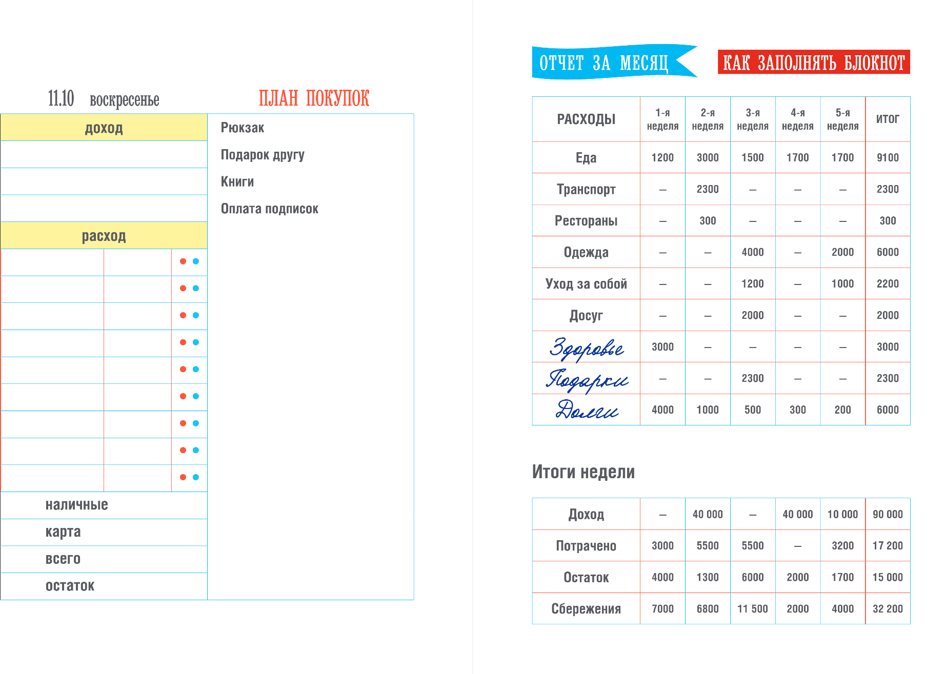 В конце месяца сложно вспомнить, на что ушли деньги. Покупали еду, в кино сходили, машину заправили. Хорошо, а куда еще? С блокнотом «Твои доходы и расходы» вы научитесь считать свои финансы. Мы создали для вас максимально продуманную концепцию для экономии ваших денег. Заполняйте странички, считайте доходы и расходы, отмечайте, что вы купили и как расплатились. Подводите итоги недели, месяца и, конечно, планируйте вперед. Попробуйте, это очень удобно!