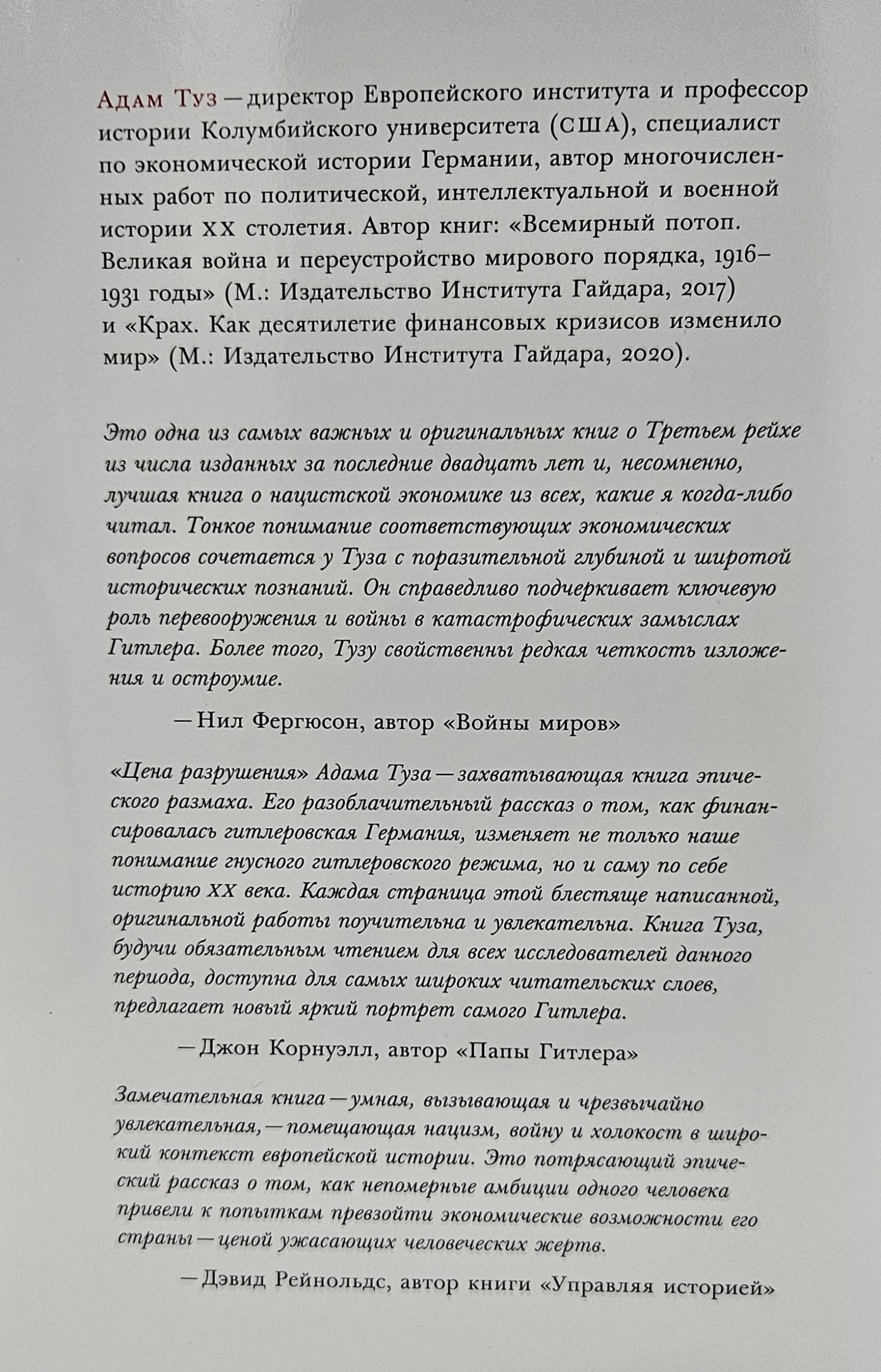 Из-под пера Адама Туза вышло первое за поколение радикально новое описание Второй мировой войны. Автор добился этого, уделив ключевое внимание экономике, наряду с расовыми отношениями и политикой. Принципиальную роль в мировоззрении Гитлера играло интуитивное понимание глобальных экономических реалий. Он догадывался, что относительная бедность Германии в 1933 г. была обусловлена не только Великой депрессией, но и ограниченностью территории и естественных ресурсов страны. Он предвидел становление нового, глобализованного мира, в котором Европа будет задавлена сокрушительной мощью Америки. Оставался последний шанс: европейское сверхгосударство во главе с Германией.
