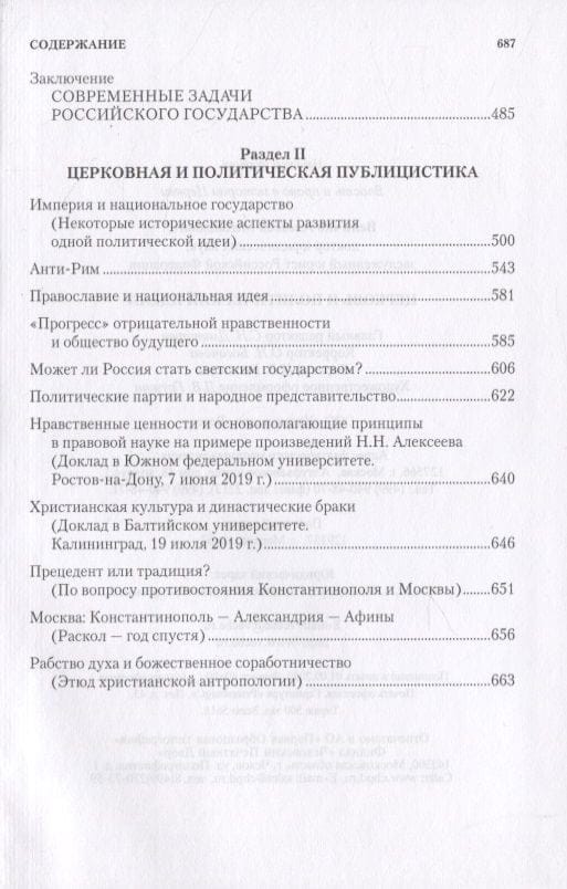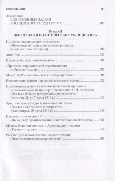 Книга "Церковь и политический идеал" включает в себя две монографии "Христианство и социальный идеал (философия, право и социология индустриальной культуры)" и "Философия русской государственности", в которых излагаются основополагающие политические и правовые идеи западной культуры, а также противостоящие им основные начала православной политической мысли, как они раскрылись в истории нашего Отечества. Особое внимание автор уделяет родству политических идей Римско-католической церкви и Реформации с последующими доктринами либерализма и социализма, а также анализу популярного в настоящее время учения постиндустриализма, должному, по мнению его родоначальников, преодолеть современные проблемы взаимоотношения общества и государства, максимально полно обеспечив при этом свободу личности. Помимо этого, во второй части книги содержатся работы по церковной и политической публицистике, в которых раскрываются такие дискуссионные и актуальные темы как имперская форма бытия государства, доктрина "Москва - Третий Рим" ("Анти-Рим"), а также причины и следствия церковного раскола, возникшего между Константинопольской и Русской церквами в минувшие годы.