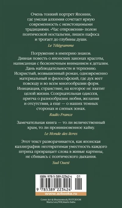 Ее новый роман «Час откровения» и предыдущий, «Только роза», складываются в объемную картину, разомкнутую историю, чьи герои проживают свои безусловно взаимосвязанные жизни, не встречаясь ни во времени, ни в пространстве. В романе «Только роза» сорокалетняя женщина приезжала в Японию, чтобы обрести корни, потерянные с рождения, и понять незнакомого покойного отца, на протяжении всего романа остававшегося за кадром; в кадре была только Роза. В «Часе откровения» за кадром остается она, а в кадре — главный герой, отец Розы, коллекционер и торговец современным японским искусством Хару Уэно, которого неодолимая любовь к красоте еще в молодости наделила безошибочно точным взглядом на прекрасное и погнала прочь из глубинки в Киото. «Час откровения» — поэтичная, проникновенная и глубокая история Хару, его друзей (художников по профессии или в глубине души), его любви к дочери — любви на расстоянии, деликатной и неотступной, — и его постепенного неотвратимого самопознания.
