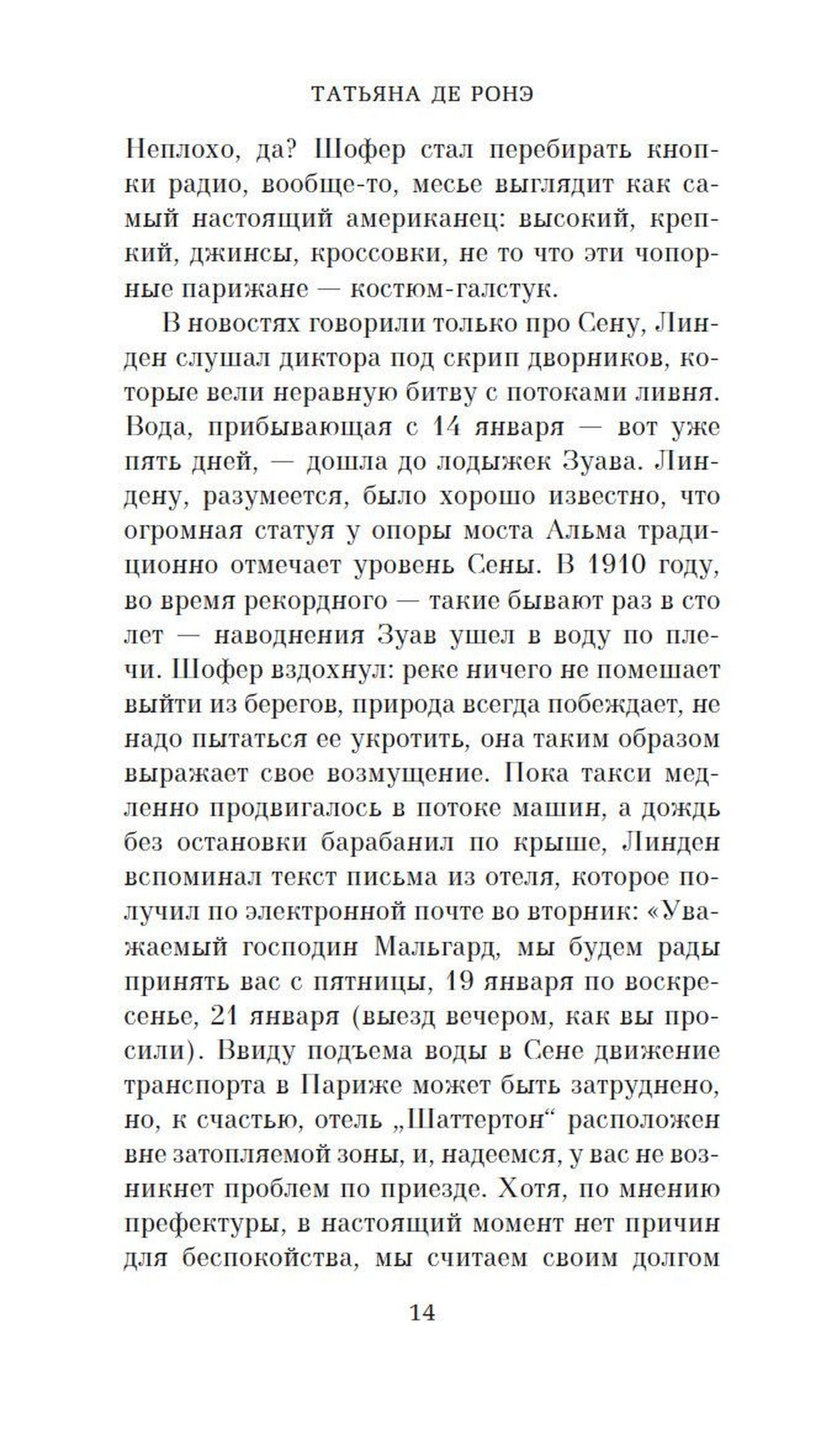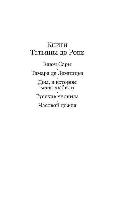 Татьяна де Ронэ — англо-французская писательница, сценарист, журналист и литературный критик, произведения которой переведены на многие языки мира и изданы миллионными тиражами. Но самый громкий ее успех связан с романом «Ключ Сары» и одноименным фильмом с Кристин Скотт-Томас в главной роли, обошедшим мировые экраны.