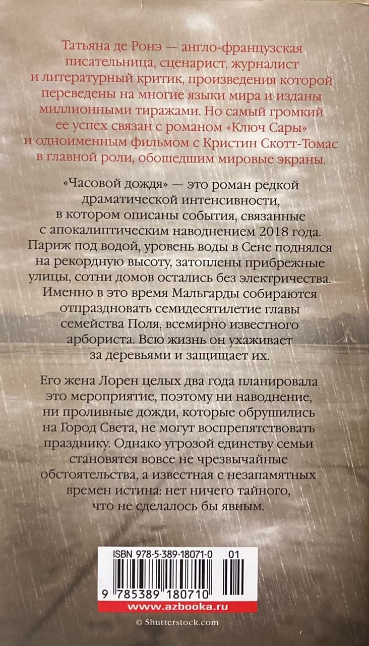 «Часовой дождя» - это роман редкой драматической интенсивности, в котором психологическому напряжению способствует апокалиптическое наводнение. Париж под водой, уровень воды в Сене поднялся на рекордную высоту, затоплены прибрежные улицы, сотни домов остались без электричества. Именно в это время Мальгарды собираются отпраздновать семидесятилетие главы семейства Поля, всемирно известного арбориста. Всю жизнь он ухаживает за деревьями и защищает их. Даже имена для детей он выбрал в честь липы, своего любимого дерева. Его жена Лорен целых два года планировала это мероприятие, поэтому ни наводнение, ни проливные дожди, которые обрушились на Город Света, не могут воспрепятствовать празднику. Однако угрозой единству семьи становятся вовсе не чрезвычайные обстоятельства, а известная с незапамятных времен истина: нет ничего тайного, что не сделалось бы явным.