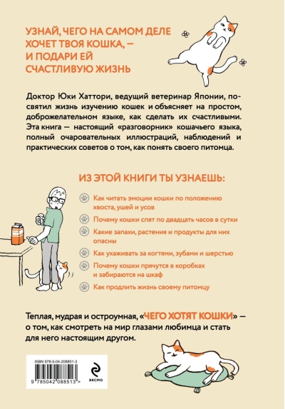 Кошки не так просты, как кажутся. Им важно, где стоит миска, какой температуры вода, как звучит твой голос и насколько удобна лежанка. От этих мелочей зависит их здоровье и настроение — а значит, и твой домашний уют. Доктор Юки Хаттори, ведущий ветеринар Японии, посвятил жизнь изучению кошек и объясняет на простом, доброжелательном языке, как сделать их счастливыми. Эта книга — настоящий «разговорник» кошачьего языка, полный забавных цветных иллюстраций, наблюдений и простых, теплых советов о том, как понять своего хвостатого друга.