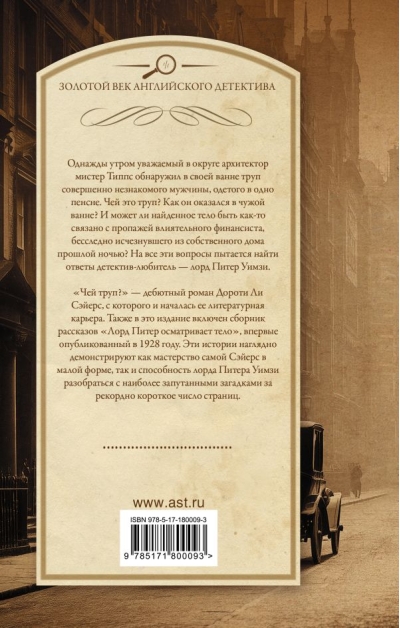 «Чей труп?» — дебютный роман Дороти Ли Сэйерс, с которого и началась ее литературная карьера. Также в это издание включен сборник рассказов «Лорд Питер осматривает тело», впервые опубликованный в 1928 году. Эти истории наглядно демонстрируют как мастерство самой Сэйерс в малой форме, так и способность лорда Питера Уимзи разобраться с наиболее запутанными загадками за рекордно короткое число страниц.