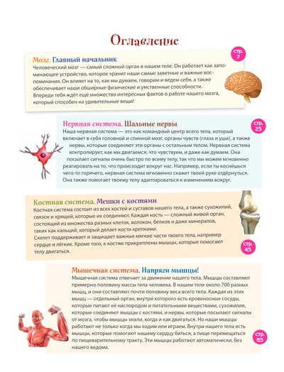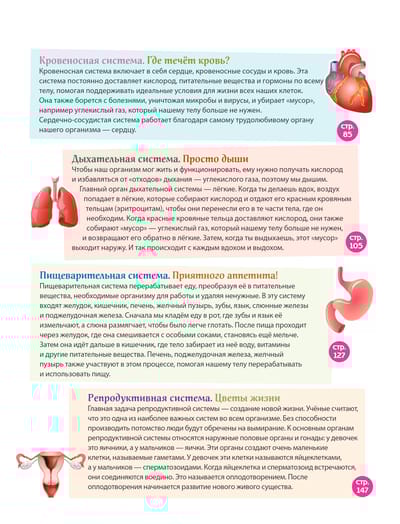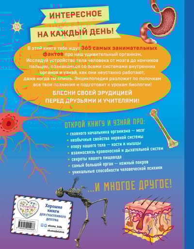 Энциклопедия на все 365 дней в году в самом популярном формате вопросов и ответов, разработанная специально для ребят 10—12 лет! В одной книге — целых 365 ответов на все вопросы школьника про устройство и способности тела человека. Полезная информация изложена просто и доступно, поэтому чтение увлечёт ребёнка и легко наполнит новыми знаниями и интересом к изучению мира вокруг. А яркое оформление превратит эту энциклопедию в идеальную настольную книгу любознательного школьника.