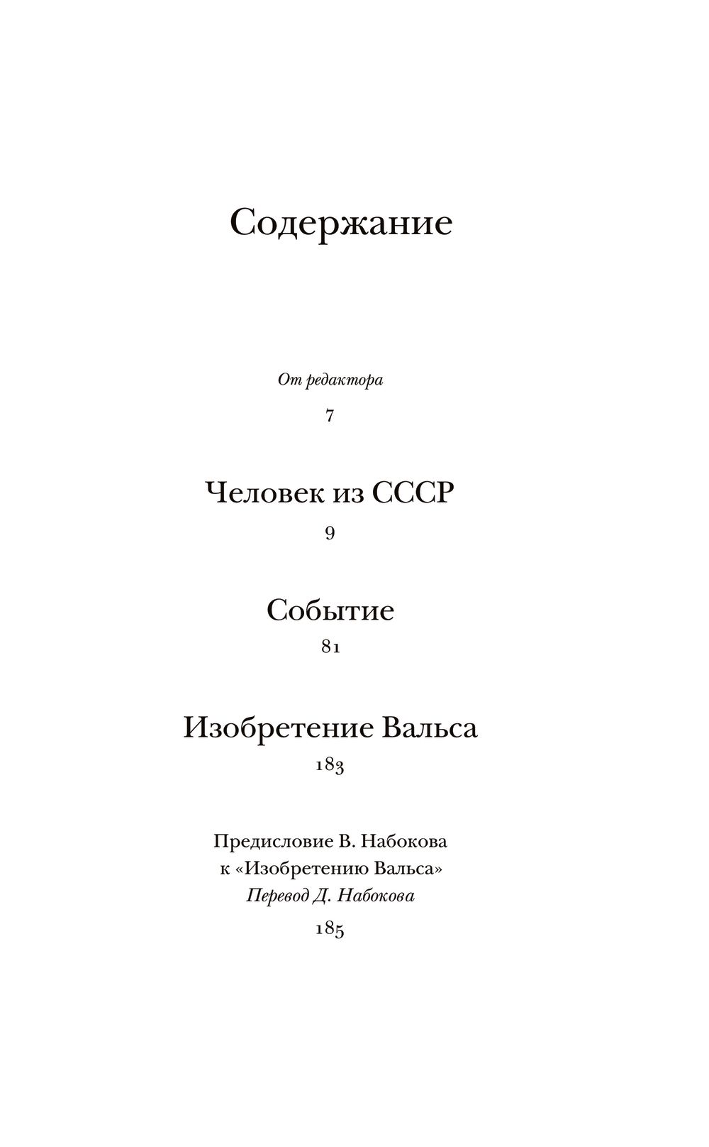 Настоящий сборник составили пьесы Владимира Набокова «Человек из СССР», «Событие» и «Изобретение Вальса», создававшиеся в Германии и Франции в 1926–1938 гг. В отличие от ранних стихотворных пьес, они написаны прозой, в которой уже признанный писатель продолжает свои тематические и сюжетные поиски. Таинственные проекты приехавшего из СССР в Берлин Кузнецова, семейная драма художника Трощейкина, безумное кружение изобретателя Вальса между реальностью и фантазией — конфликты и коллизии этих пьес удивительно современны и увлекательны.