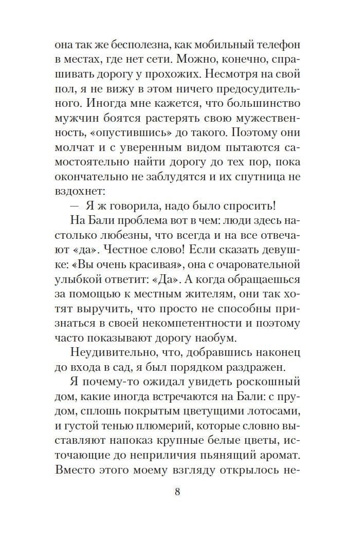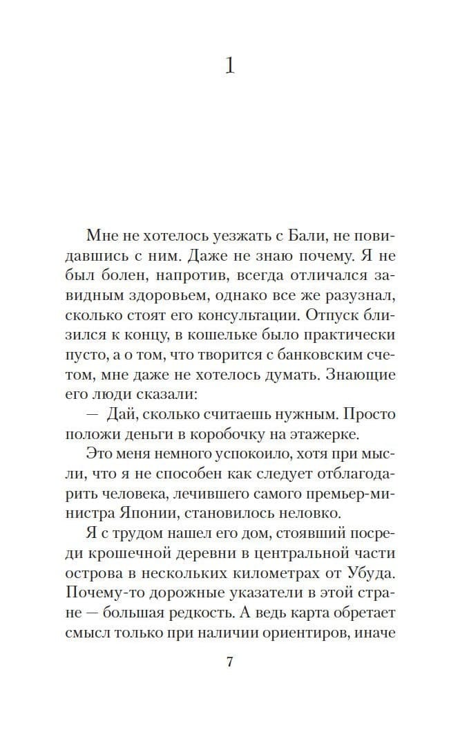 Каждый человек мечтает обрести счастье. Но порой эта мечта так никогда и не воплощается в жизнь. Нам постоянно мешают какие-то внешние обстоятельства, на первый взгляд непреодолимые. Юлиан, герой романа Гунеля, молод, здоров, хорош собой и… отчаянно недоволен своей жизнью, хотя объективно ему ничто не мешает быть счастливым. Оказавшись на Бали, он попадает в затерянную среди тропических лесов деревеньку, где знакомится со стариком-целителем по имени Сантьянг. О нем на острове ходят легенды. Мудрый старец врачует не тело, а душу человека. И ему ведома истина, способная изменить весь мир вокруг нас: то, во что мы верим, становится нашей реальностью и определяет нашу жизнь.Книга Лорана Гунеля, входящего в пятерку самых популярных беллетристов Франции. стала всемирным бестселлером, несколько лет возглавляла топ-листы продаж во Франции и была переведена на двадцать пять языков.