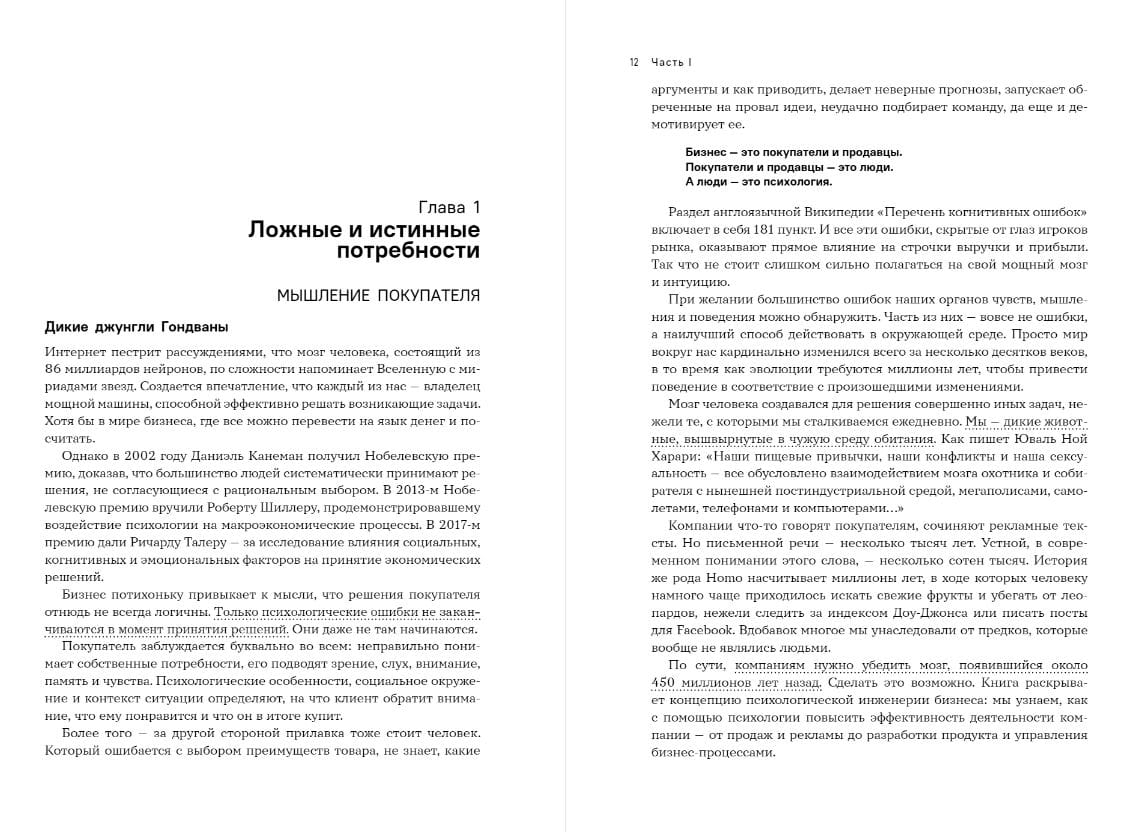 Поведение человека покупающего — неизведанная территория для маркетологов и продаванов. В 2002 году Даниэль Канеман получил Нобелевскую премию, доказав, что большинство людей принимают иррациональные решения. Действительно, эволюция человеческого мозга насчитывает миллионы лет, в ходе которых нам чаще приходилось убегать от леопардов, чем следить за индексом Доу-Джонса. Современные компании сочиняют рекламные тексты и формируют ценность продукта, зачастую не зная, что именно заставляет людей покупать. Эта книга — ключ к пониманию скрытых механизмов принятия решения современными покупателями. Николай Молчанов — кандидат психологических наук, MBA в бизнес-школе INSEAD, один из лучших экспертов в области управления поведением покупателей. Автор одного из самых популярных Telegram-каналов Рунета «Психология маркетинга», который читают более 60 000 человек. В своей книге он объясняет, по каким законам работает человеческий мозг и как психология поможет повысить эффективность компании — от разработки продукта до управления бизнес-процессами. • Почему механизм принятия решений одинаков, когда человек покупает коврик в ванную и когда выбирает, в какую сторону свайпнуть фото в Tinder? • Каким образом шокированные пуэрториканские макаки-резусы связаны с нашей любовью поумничать и что это означает для маркетинга? • В чем заключается «эффект ИКЕА» и как с помощью него увеличить прибыль?