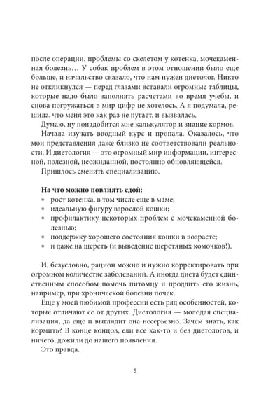 Вы узнаете про роли белков, жиров и углеводов, сможете разобраться в заумных этикетках кормов и даже понять, почему ваша кошка иногда предпочитает охотиться на мух, а не есть вкусности из миски. Разберетесь в опасностях витаминов, и поймете, когда они будут необходимы. Выбор между домашней едой и промышленными кормами и понимание, какие продукты действительно полезны для кошачьего здоровья, больше не будут такими сложными.