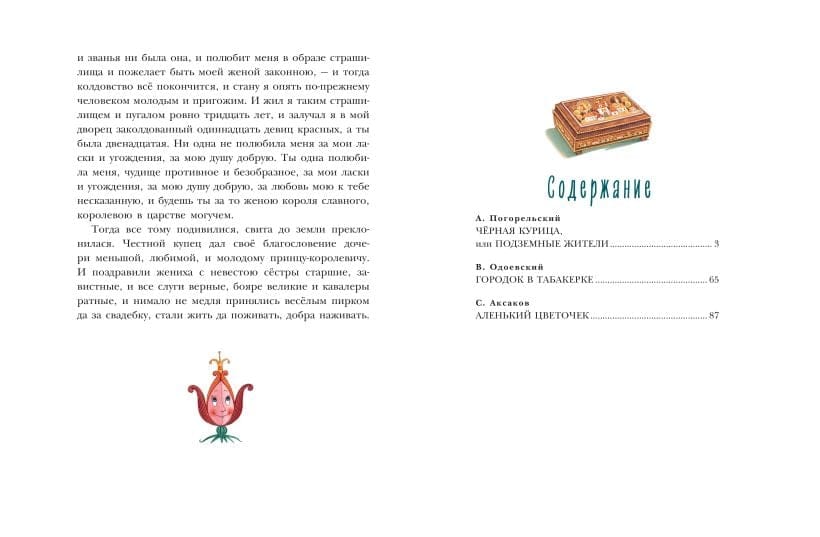 В сборник вошли сказки, в которых герои попадают в удивительные, скрытые от посторонних глаз волшебные миры. Подземное царство в «Чёрной курице» населено маленькими человечками ростом с пол-аршина. Дремучий лес в «Аленьком цветочке» скрывает роскошный дворец с чудищем невиданным. В поселении Динь-Динь в сказке «Городок в табакерке» каждая деталь музыкальной шкатулки оказывается живым человечком. В конце концов доброта, сострадание и честность побеждают в любом мире, в волшебном и реальном!