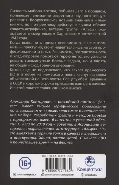 Личность майора Котова, побывавшего в прошлом, привлекает внимание секретного научного спецуправления, изучающего феномен попаданцев. Вооружившись новыми знаниями и умениями, но по-прежнему действуя в чужом облике солдата-штрафника, ветеран группы «Альфа» оказывается в смертельном Харьковском котле весной 1942 года. Когда выполнить приказ невозможно, а не выполнить – преступно, стоит надеяться лишь на свой профессионализм и опыт. Решимость, рассудительность и хладнокровие помогают герою не только успешно решать сиюминутные боевые задачи, но и влиять на общий исход военной операции. Котов еще не подозревает, что захват вражеского ДОТа и побег из немецкого плена станут началом объявленной на него охоты. Спецслужбам Германии и СССР в короткие сроки приказано взять его живым. И в этой схватке ставки слишком высоки…