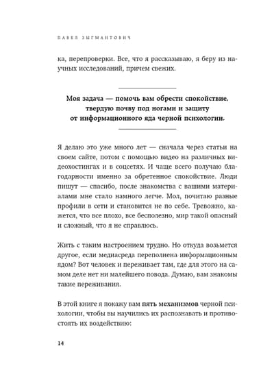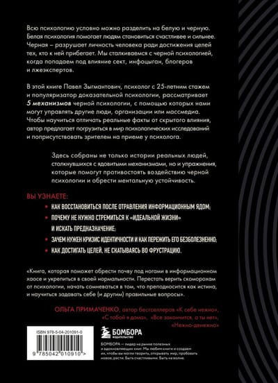 В этой книге Павел Зыгмантович, психолог с 25-летним стажем и популяризатор доказательной психологии, рассматривает 5 механизмов черной психологии, с помощью которых нами могут управлять другие люди, организации или массмедиа. Чтобы научиться отличать реальные факты от скрытого влияния, автор предлагает погрузиться в мир психологических исследований и поприсутствовать зрителем на приеме у психолога.