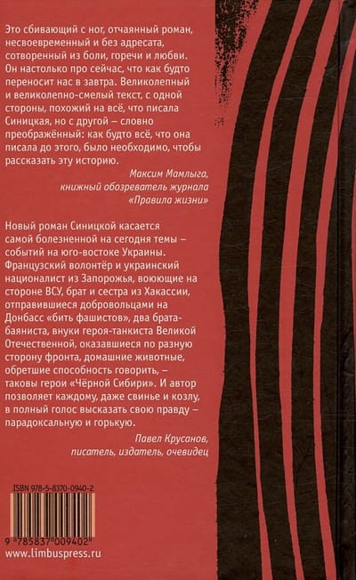 София Синицкая – лауреат премии Гоголя, финалист премий «Большая книга», «Ясная Поляна», «Национальный бестселлер», «Нос». Название её нового романа отсылает к «Полдневной песне» Бодлера – «Чёрной Сибирью» поэт называет состояние депрессии, меланхолии. Герой романа Синицкой, французский волонтёр Гастон Мушабьер, бежит от своей экзистенциальной тоски на юго-восток Украины, где пытается в зоне военных действий найти смысл жизни и вырваться из мучительных объятий душевной болезни под названием «Чёрная Сибирь».
