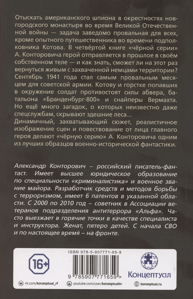 Отыскать американского шпиона в окрестностях новгородского монастыря во время Великой Отечественной войны – задача заведомо провальная для всех, кроме опытного путешественника во времени подполковника Котова. В четвёртой книге «чёрной серии» А. Конторовича герой отправляется в прошлое в своём собственном теле – и как знать, сможет ли на этот раз вернуться живым с захваченной немцами территории? Сентябрь 1941 года стал самым провальным месяцем для советской армии. Котову и горстке попавших в окружение солдат противостоят силы абвера, батальона «Бранденбург-800» и снайперы Вермахта. Но ещё много загадок, о которых неизвестно даже спецслужбам, скрывают здешние леса... Динамичный, захватывающий сюжет, реалистичное изображение сцен и повествование от лица главного героя делают «чёрную серию» А. Конторовича одним из лучших образцов военно-исторической фантастики.