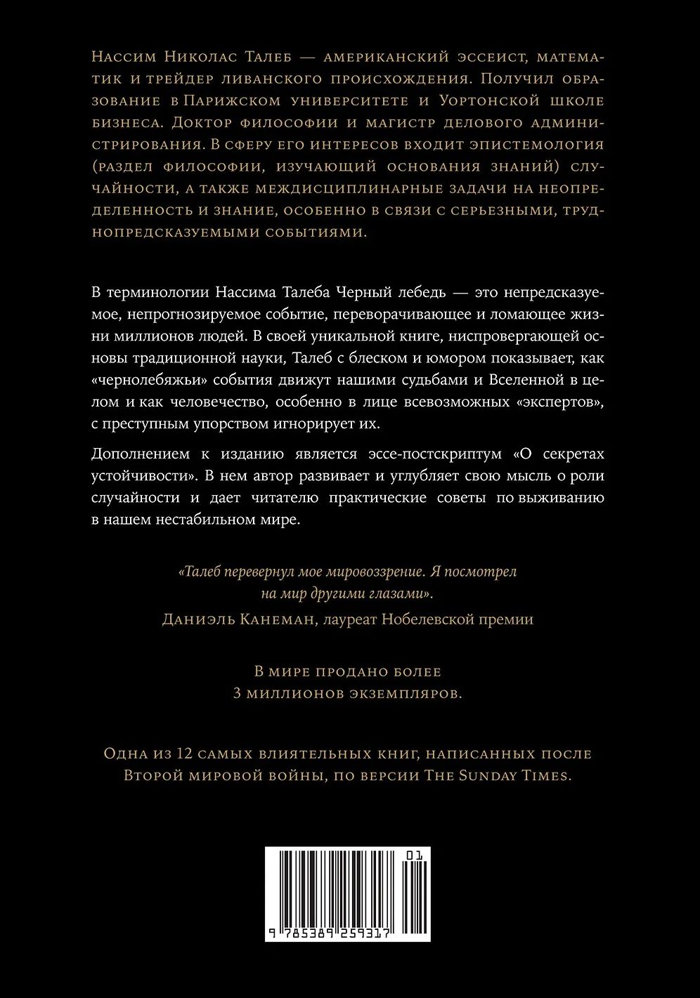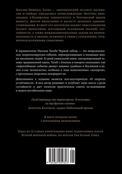 За одно только последнее десятилетие человечество пережило ряд тяжелейших катастроф, потрясений и катаклизмов, не укладывающихся в рамки самых фантастических предсказаний. Выпускник Сорбонны и нью-йоркский финансовый гуру Нассим Талеб называет такие непрогнозируемые события Черными лебедями. Он убежден: именно они дают толчок как истории в целом, так и существованию каждого отдельного человека. И чтобы преуспеть, надо быть к ним готовыми. Сразу после выхода «Черного лебедя» автор блестяще продемонстрировал свою «не-теорию» на практике: на фоне финансового кризиса компания Талеба заработала (а не потеряла!) для инвесторов полмиллиарда долларов. Но его труд — не учебник по экономике. Это размышления незаурядного человека о жизни и о том, как найти в ней свое место.
