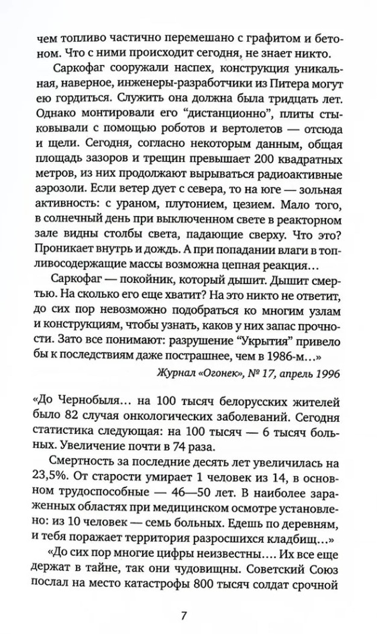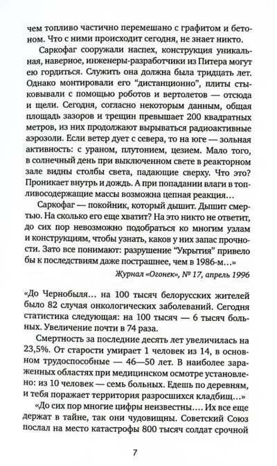Главной техногенной катастрофе XX века посвящена четвертая книга знаменитого художественно-документального цикла «Голоса Утопии» Светланы Алексиевич, лауреата Нобелевской премии по литературе «за многоголосое творчество – памятник страданию и мужеству нашего времени». «Совпали две катастрофы: космическая – Чернобыль, и социальная – ушел под воду огромный социалистический материк. И это, второе, крушение затмило космическое, потому что оно нам ближе и понятнее. То, что случилось в Чернобыле, – впервые на земле, и мы – первые люди, пережившие это». «Чернобыльская молитва» публикуется в новой авторской редакции, с добавлением 30 процентов нового текста, с восстановлением фрагментов, исключенных из прежних изданий по цензурным соображениям.