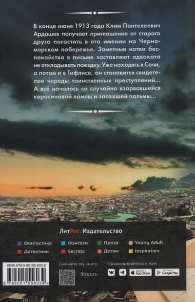 В конце июня 1913 года Клим Пантелеевич Ардашев получает приглашение от старого друга погостить в его имении на Черноморском побережье. Заметные нотки беспокойства в письме заставляют адвоката не откладывать поездку. Уже находясь в Сочи, а потом и в Тифлисе, он становится свидетелем череды таинственных преступлений… А всё началось со случайно взорвавшейся керосиновой лампы и засохшей пальмы…