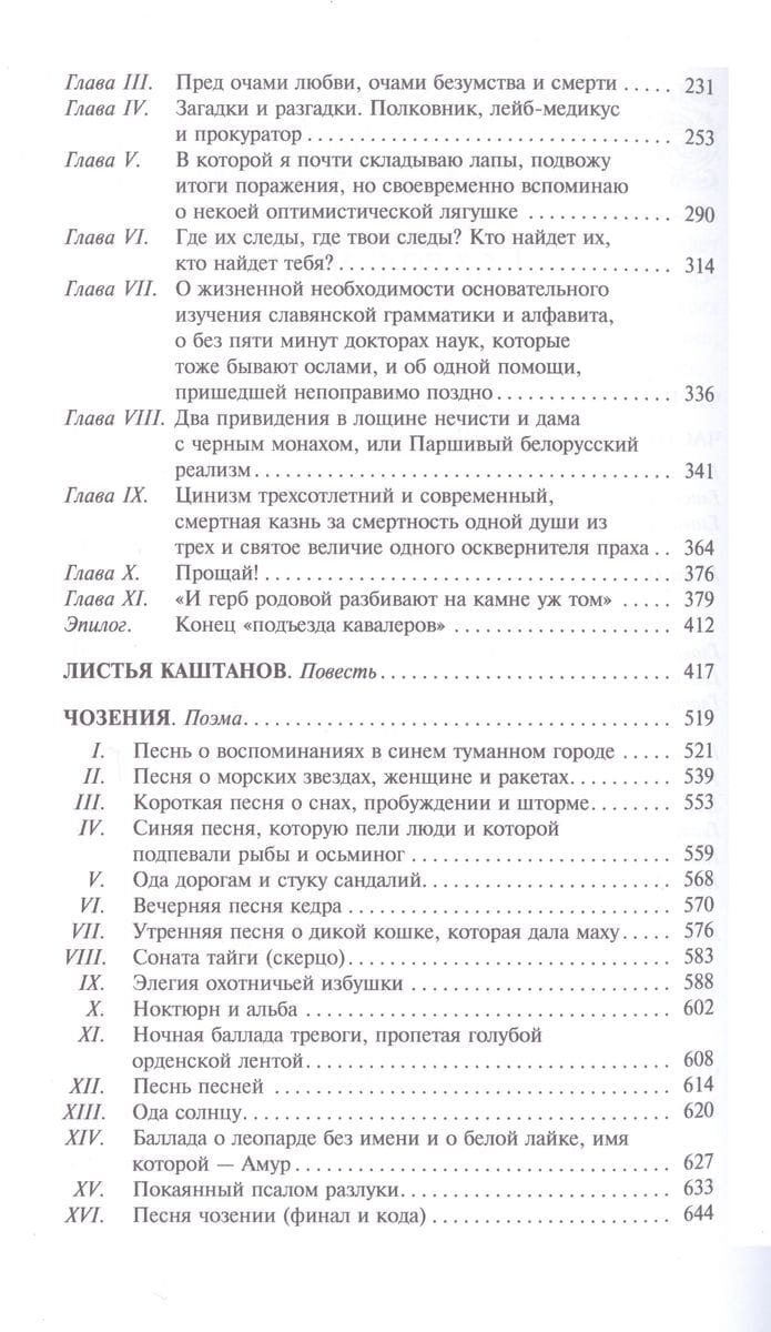 Роман «Черный замок Ольшанский», имея детективный сюжет, затрагивает сложные вопросы ответственности за поступки, совершаемые и в Средневековье, и во время Великой Отечественной войны, и в послевоенные годы. Главному герою, историку по образованию, приходится воспользоваться всем багажом знаний, чтобы раскрыть преступление. Повесть «Листья каштанов» посвящена подросткам, которые в только что освобожденном от фашистов Киеве всеми силами стараются повзрослеть и попасть на фронт, при этом их необдуманные поступки приводят к трагедии. Прозаическое произведение «Чозения» получила авторское жанровое определение поэма. Захватывающий сюжет на фоне экзотической дальневосточной природы не оставляет равнодушным и заставляет думать о единстве всего живого на земле, о любви и разлуке, о необходимости не разрушать, а созидать.