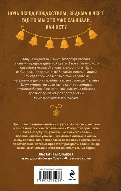 Канун Рождества. Санкт-Петербург утопает в снегу и предпраздничной суете. А вот у титулярного советника Акакия Агаповича, скромного черта из Синода, нет времени любоваться иллюминацией. Его ждет срочное, и прямо-таки чертовски неприятное дело: старейшая ведьма столицы Меланья Штук умерла, не сдав казне своих восьмерых служилых бесов. А ее неприкаянная душа сбежала, грозя обернуться рождественским кошмаром для всего города.