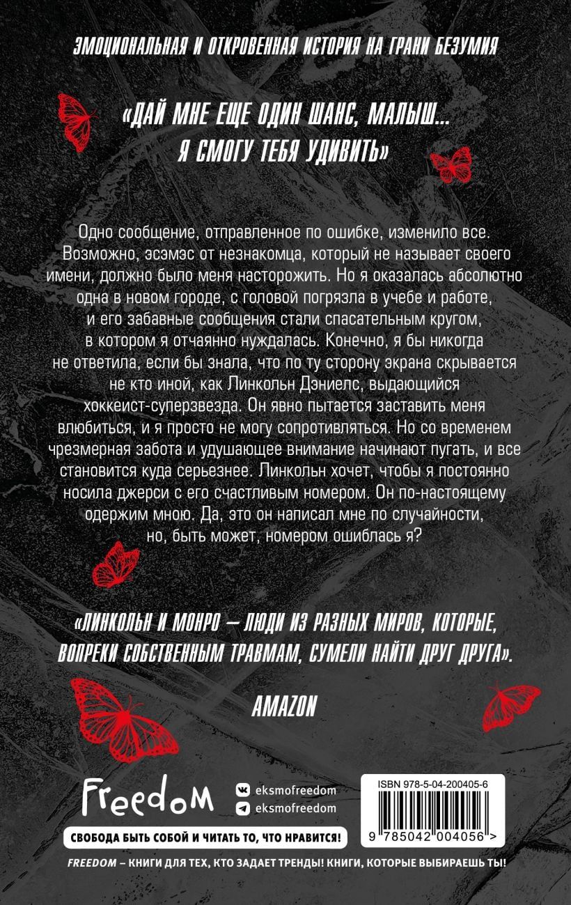 Возможно, эсэмэс от незнакомца, который не называет своего имени, должно было меня насторожить. Но я оказалась абсолютно одна в новом городе, с головой погрязла в учебе и работе, и его забавные сообщения стали спасательным кругом, в котором я отчаянно нуждалась. Конечно, я бы никогда не ответила, если бы знала, что по ту сторону экрана скрывается не кто иной, как Линкольн Дэниелс, выдающийся хоккеист-суперзвезда. Он явно пытается заставить меня влюбиться, и я просто не могу сопротивляться. Но со временем чрезмерная забота и удушающее внимание начинают пугать, и все становится куда серьезнее. Линкольн хочет, чтобы я постоянно носила джерси с его счастливым номером. Он по-настоящему одержим мною. Да, это он написал мне по случайности, но, быть может, номером ошиблась я?