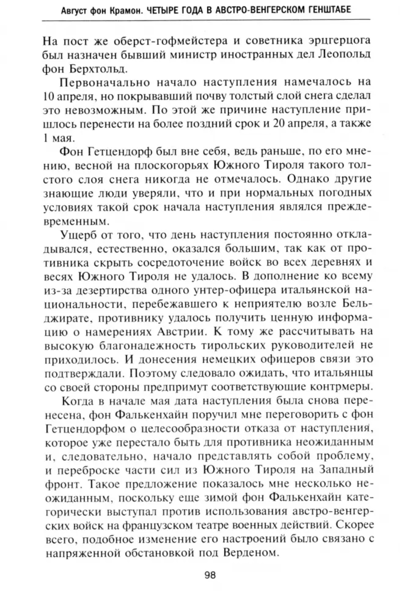 Август фон Крамон (1861-1940) в годы Первой мировой войны был назначен полномочным представителем Германии при Генеральном штабе австро-венгерской армии. Будучи связующим звеном между ставками двух держав, генерал-майор фон Крамон принимал непосредственное участие в разработке и проведении военных операций, поддерживал контакты между союзниками и высшим руководством армий, а потому смог с документальной точностью отобразить положение дел в Австро-Венгрии в 1914-1918 гг. Автор достоверно и беспристрастно описывает не только крупные сражения, переговоры о мире, падение монархии в России и другие значительные события Первой мировой войны, но и интриги в верховном командовании, дипломатические уловки и неоднозначные политические соглашения, определившие ход войны.