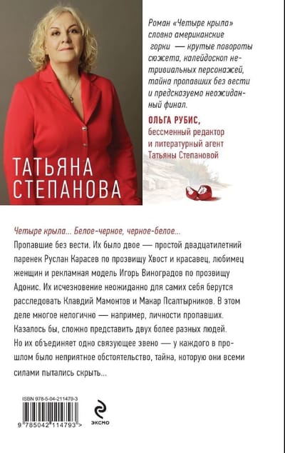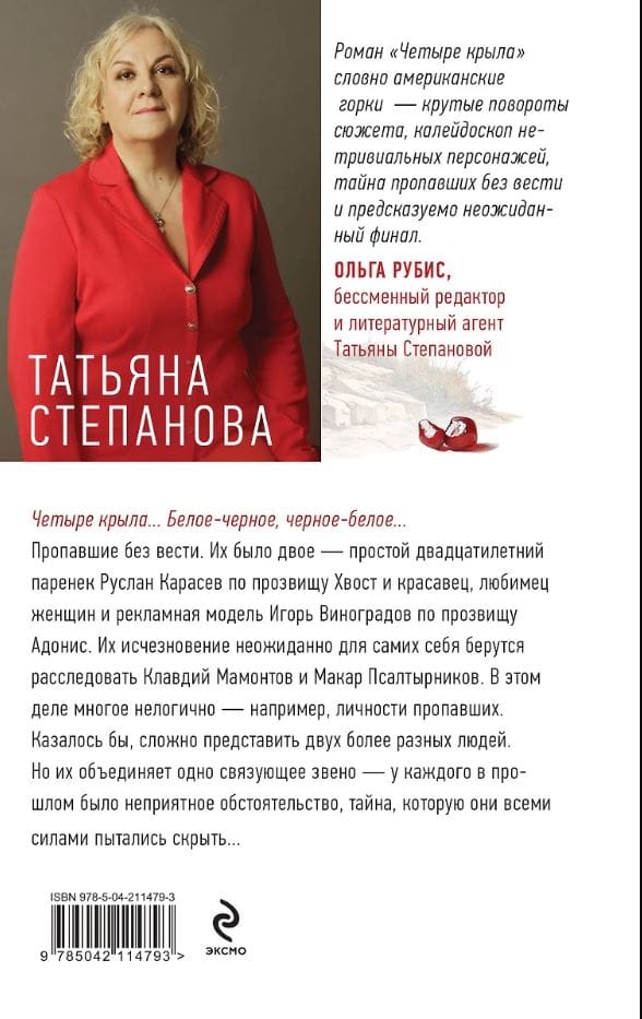 Клавдию Мамонтову и Макару Псалтырникову предстоит разгадать новую детективно-мистическую головоломку в остросюжетном романе Татьяны Степановой «Четыре крыла». Татьяна Степанова — подполковник полиции, бывший сотрудник Пресс-центра ГУВД Московской области и следователь, поэтому ее истории так правдоподобно и детально описывают расследования криминальных загадок.