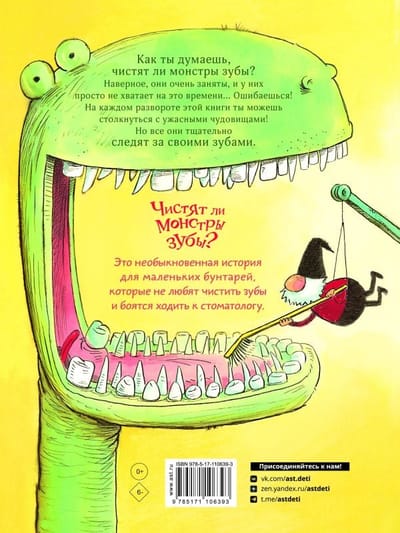 Даже страшные монстры чистят зубы! Не веришь? Вот и маленькая девочка из этой книги, которая очень не любила чистить зубы, не верила в эту чепуху. Будь осторожен… на каждом развороте ты можешь столкнуться с ужасными чудовищами! Но все они тщательно следят за своими зубами. Молодой иллюстратор Грегуар Мабир просто обожает рисовать смешных монстров. Поэтому книга «Чистят ли монстры зубы?» получилась такой забавной и запоминающейся. Это отличное пособие для маленьких бунтарей, которые отказываются чистить зубы и боятся ходить к стоматологу.