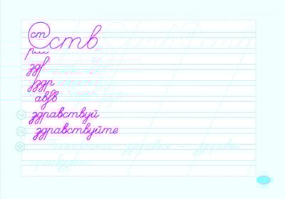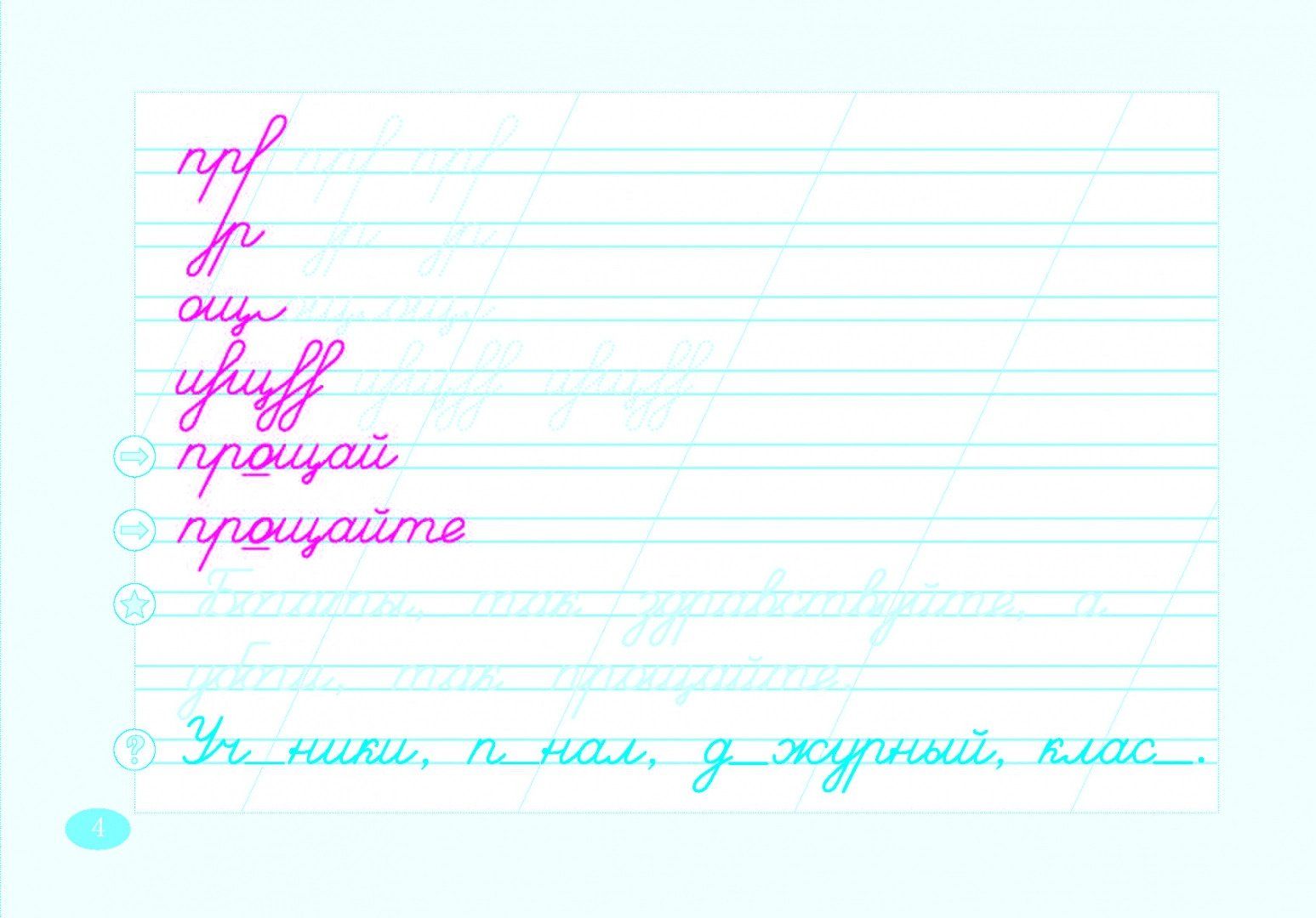 Основу чистописания составляют росчерки (с них начинается каждая страничка). Они направлены на отработку соединений букв, которые дальше лежат в основе словарного слова (слов). Работа со словарным словом ведётся согласно методике преподавания русского языка в начальных классах (тема урока). Внизу страницы дана пословица, в которую включено изучаемое слово. Бледный цвет необходимо обвести (росчерки и пословицы).
