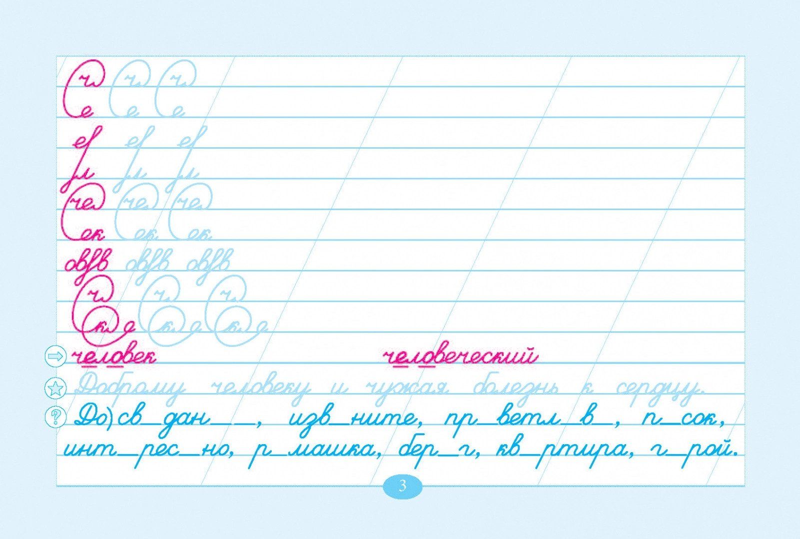 «Чистописание и словарные слова» - учебное пособие, направленное на формирование каллиграфического навыка у младших школьников. Оно привязано к темам урока, соединено со словарными словами. Основу чистописания составляют росчерки (с них начинается каждая страничка). Они направлены на отработку соединений букв, которые дальше лежат в основе словарного слова (слов). Работа со словарным словом ведётся согласно методике преподавания русского языка в начальных классах (тема урока). Внизу страницы дана пословица, в которую включено изучаемое слово. Бледный цвет необходимо обвести (росчерки и пословицы).