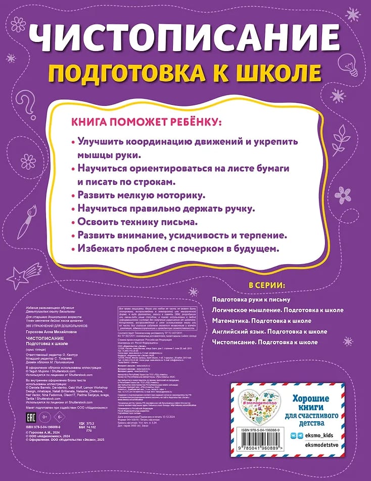 Эта книга для детей от 5 лет поможет дошкольнику развить мелкую моторику рук и научиться писать буквы, как это делают ученики первого класса. В рабочей тетради более 365 упражнений по чистописанию, рассчитанных на каждый день года. Это способствует равномерному распределению учебной нагрузки и формированию положительного отношения ребёнка к обучению в школе. Дошкольник потренируется обводить рисунки и рисовать их по образцу, писать элементы букв, буквы и целые слова. Он научится ориентироваться на листе бумаги, писать, придерживаясь строки, станет внимательным, аккуратным, самостоятельным и приобретёт другие важные навыки, необходимые при обучении в школе.