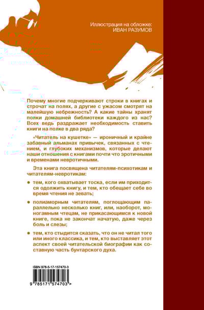 «Читатель на кушетке» — ироничный и забавный альманах привычек, связанных с чтением, и глубоких механизмов, которые делают наши отношения с книгами почти что эротичными и временами невротичными.