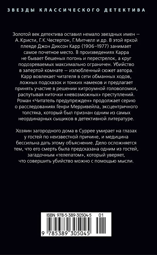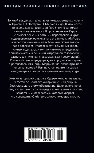 Золотой век детектива оставил немало звездных имен — А. Кристи, Г. К. Честертон, Г. Митчелл и др. В этой яркой плеяде Джон Диксон Карр (1906–1977) занимает самое почетное место. В произведениях Карра не бывает бешеных погонь и перестрелок, а круг подозреваемых максимально ограничен. Убийство в запертой комнате — излюбленный сюжет автора. Карр вовлекает читателя в сети обманных ходов, ложных подсказок и тонких намеков и предлагает принять участие в решении хитроумной головоломки, распутывая ниточки «невозможных» преступлений.