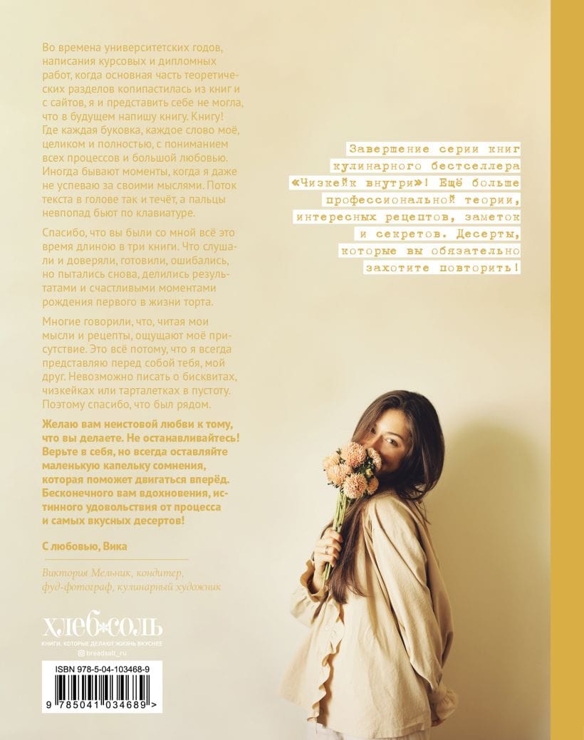 Долгожданная новинка от кондитера и популярного блогера Виктории Мельник (@vicky_bakery). Еще больше рецептов и вдохновения от художника-кондитера, книги которой стали супербестселлерами. Это третья и последняя часть из серии книг "Чизкейк внутри". Первые две побили все рекорды продаж и стали любимыми для сотен тысяч домашних кондитеров. Книги Виктории любят не только за удивительно красивую подачу и безупречный стиль фотографий. По ее рецептам действительно легко приготовить самые изысканные десерты. Абсолютно новые оригинальные авторские рецепты чизкейков и других десертов сопровождаются пошаговыми фотографиями и разделом теории с подробным описанием приготовления. Это увлекательное путешествие в мир тортов подарит вам не только вдохновение и новые кулинарные открытия, но и радость от полученных результатов.