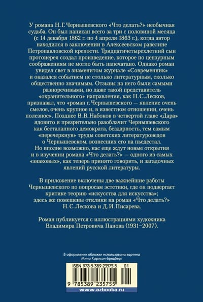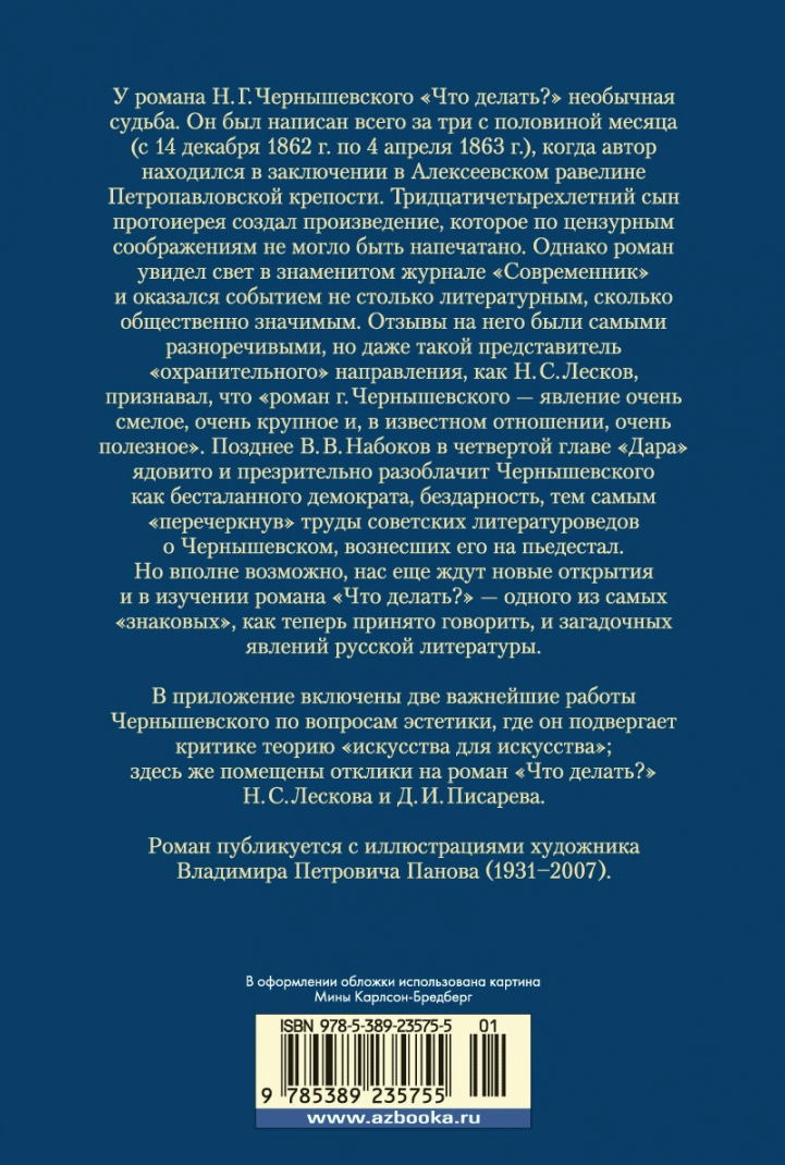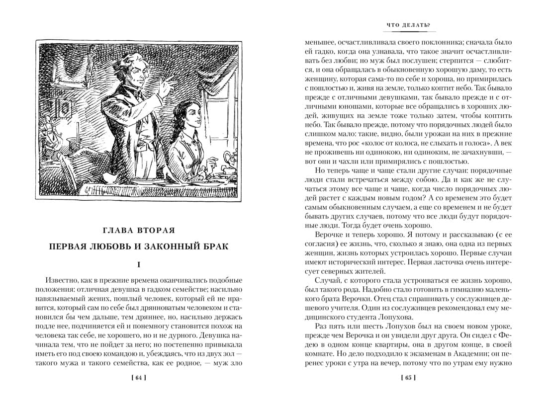 По воспоминаниям современников, не было студента или даже гимназиста, не читавшего «Что делать?». В советскую эпоху Чернышевский занял почетное место на литературном олимпе, а его главное произведение вошло в обязательную школьную программу. Сегодня обращение к роману «Что делать?» заставляет заново переосмыслить его значение в истории русской литературы и общественной жизни. В приложение включены две важнейшие работы Чернышевского по вопросам эстетики, где он подвергает критике теорию «искусства для искусства»; здесь же помещены отклики на роман «Что делать?» Н. С. Лескова и Д. И. Писарева. Роман публикуется с иллюстрациями художника Владимира Петровича Панова (1931–2007).