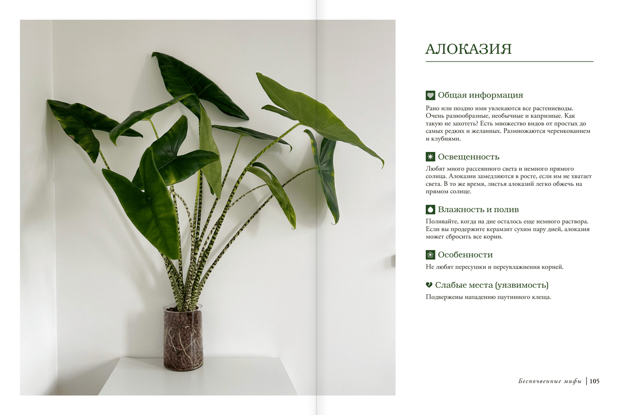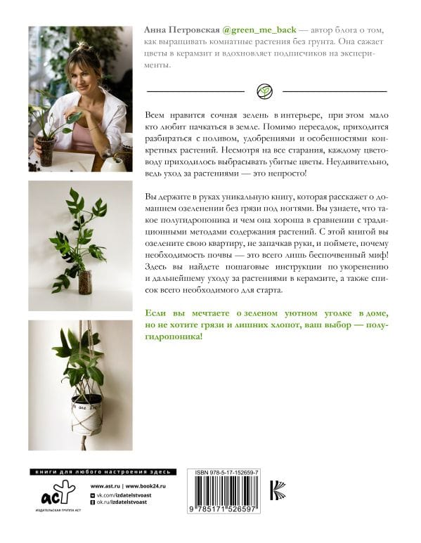 Всем нравится сочная зелень в интерьере, при этом мало кто любит пачкаться в земле. Помимо пересадок, приходится разбираться с поливом, удобрениями и особенностями конкретных растений. Несмотря на все старания, каждому цветоводу приходилось выбрасывать убитые цветы. Неудивительно, ведь уход за растениями — это непросто! Вы держите в руках уникальную книгу, которая расскажет о домашнем озеленении без грязи под ногтями. Вы узнаете, что такое полугидропоника и чем она хороша в сравнении с традиционными методами содержания растений. С этой книгой вы озелените свою квартиру, не запачкав руки, и поймете, почему необходимость почвы — это всего лишь беспочвенный миф! Здесь вы найдете пошаговые инструкции по укоренению и дальнейшему уходу за растениями в керамзите, а также список всего необходимого для старта. Если вы мечтаете о зеленом уютном уголке в доме, но не хотите грязи и лишних хлопот, ваш выбор — полугидропоника!