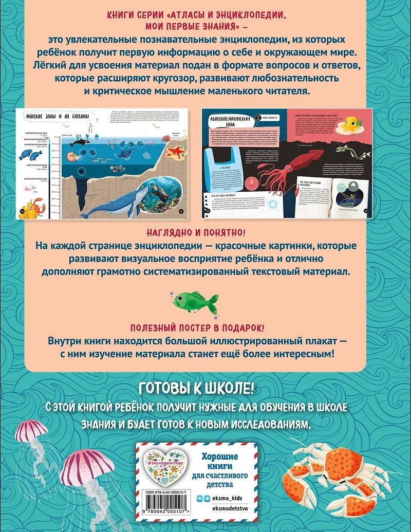 Энциклопедия в формате вопросов и ответов, созданная специально для малышей дошкольного возраста. Вместо длинных статей «научным» языком — наглядные, понятные и увлекательные рассказы о морях и океанах плюс большой постер в подарок. Удивительные рекорды Мирового океана, морские обитатели, необычные подводные места и явления — всё, что хочется знать маленькому почемучке и о чём он так любит спрашивать!
