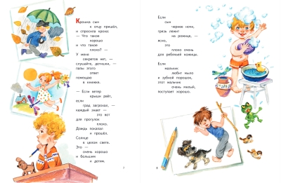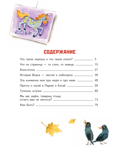 В книгу вошло 9 стихотворений замечательного русского поэта-новатора Владимира Маяковского. Впервые в детской литературе так просто, звонко и ритмично было сказано об очень важных вещах: например, о необходимости учиться («История Власа — лентяя и лоботряса») или об умении различать добро и зло и поступать правильно («Что такое хорошо и что такое плохо?»). Создание деревянной лошадки («Конь-огонь») под пером поэта превращается в увлекательный процесс, воспитывающий в юном читателе уважение к труду, а стихотворение «Что ни страница — то слон, то львица» дарит ощущение весёлой и интересной прогулки по зоопарку. И, конечно, прочитав «Тучкины штучки», вся семья с удовольствием будет наблюдать за необычными превращениями облаков.
