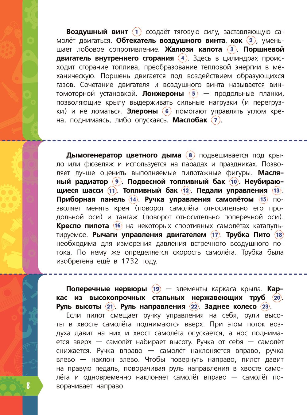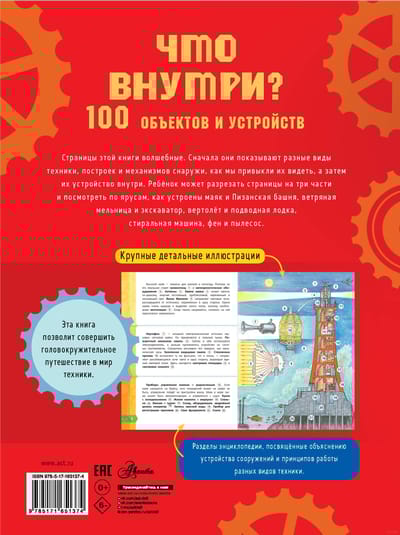 Красочная энциклопедия для детей «Что внутри? 100 объектов и устройств» расскажет не только о разных видах техники: от автомобиля, самолёта, танка и бронетранспортёра до стиральной машины, холодильника, фена и пылесоса, но и проведёт экскурсию внутрь необычных зданий и сооружений. Вы узнаете, как устроена пирамида Хеопса и Спасская башня, какого размера куранты, почему Пизанская башня имеет наклон на юг, как работают ветряной генератор и ветряная мельница, какая башня самая высокая в мире, что такое линза Френеля и многое другое.