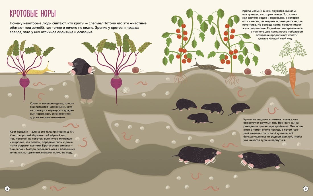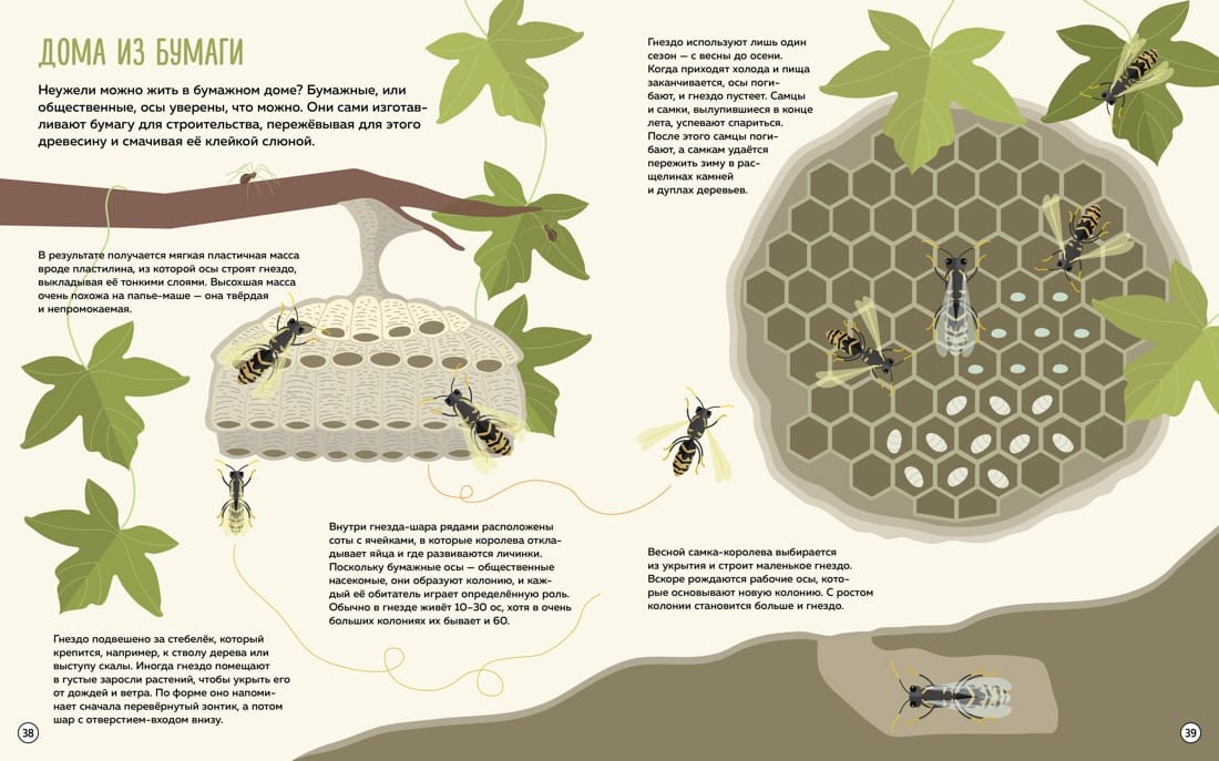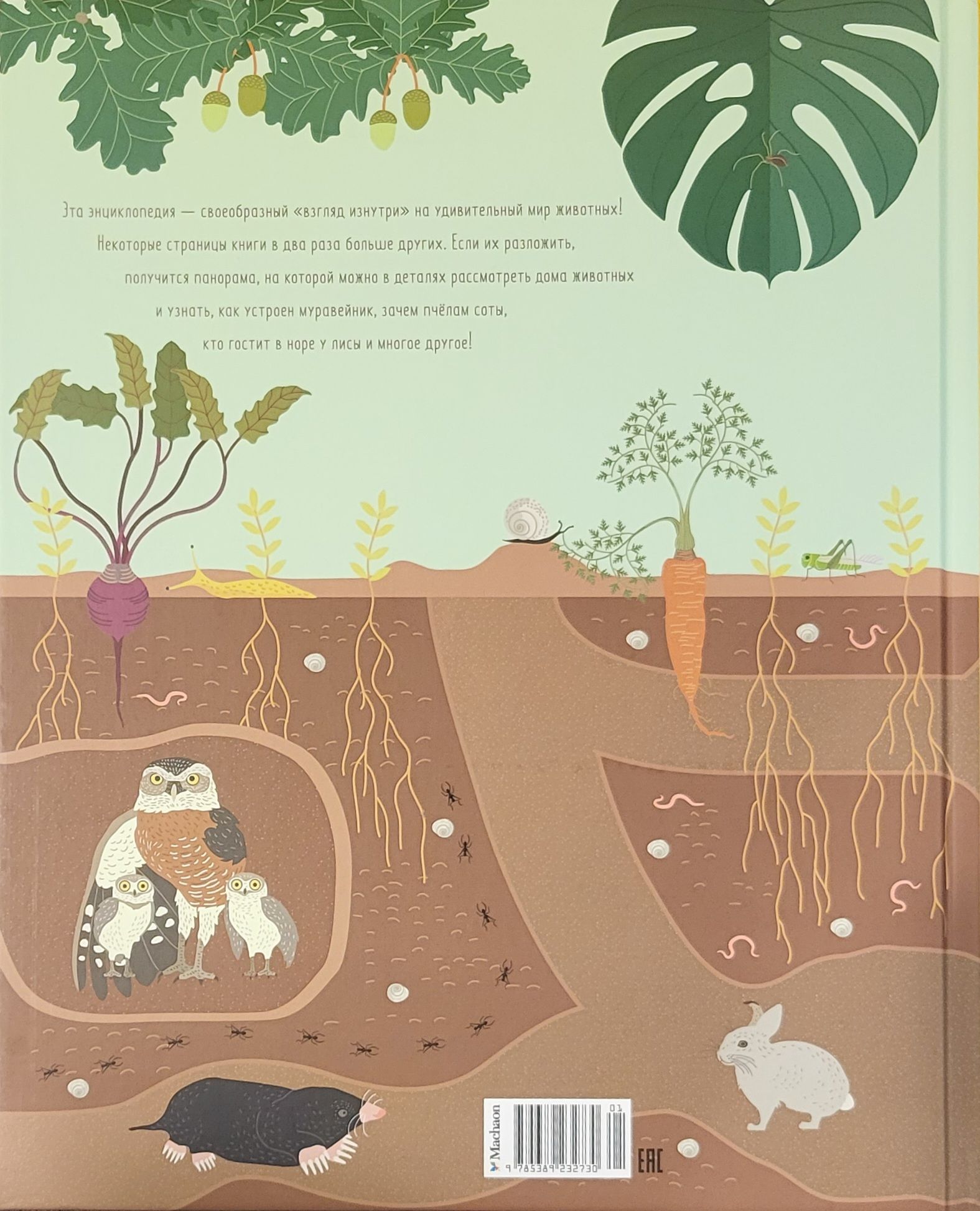 Эта энциклопедия — своеобразный «взгляд изнутри» на удивительный мир животных. Некоторые страницы книги в два раза больше других. Если их разложить, получится панорама, на которой можно в деталях рассмотреть дома животных и узнать, как устроен муравейник, зачем пчёлам соты, кто гостит в норе у лисы и многое другое.