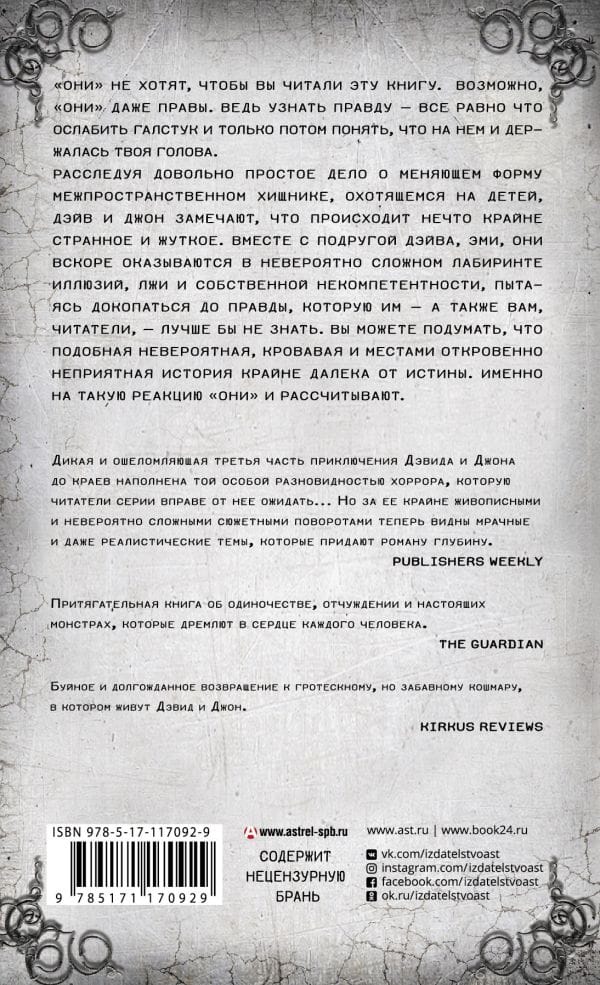 «Они» не хотят, чтобы вы читали эту книгу. Возможно, «Они» даже правы. Ведь узнать правду — все равно что ослабить галстук и только потом понять, что на нем и держалась твоя голова. Расследуя довольно простое дело о меняющем форму межпространственном хищнике, охотящемся на детей, Дэйв и Джон замечают, что происходит нечто крайне странное и жуткое. Вместе с подругой Дэйва, Эми, они вскоре оказываются в невероятно сложном лабиринте иллюзий, лжи и собственной некомпетентности, пытаясь докопаться до правды, которую им — а также вам, читатели,— лучше бы не знать. Вы можете подумать, что подобная невероятная, кровавая и местами откровенно неприятная история крайне далека от истины. Именно на такую реакцию «Они» и рассчитывают.