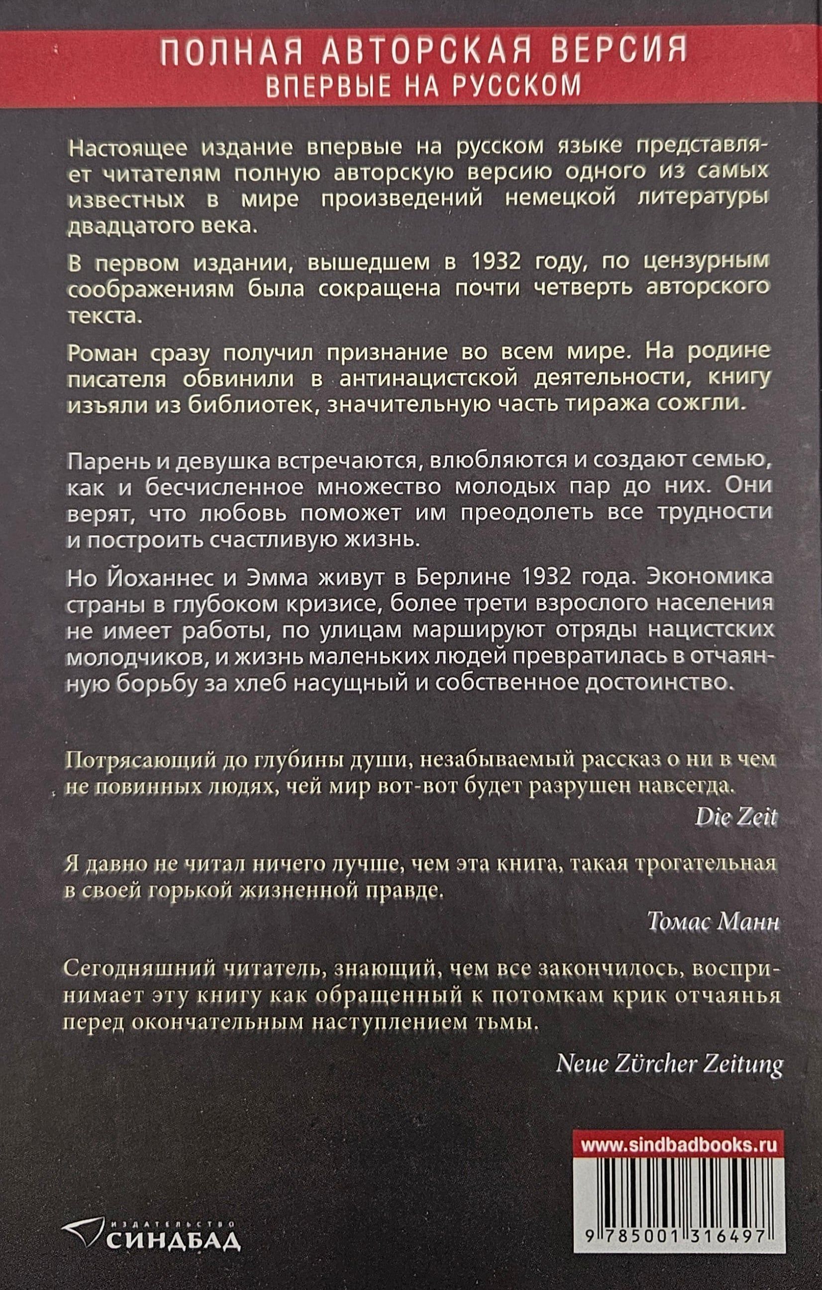 Настоящее издание впервые на русском языке представляет читателям полную авторскую версию исторического романа одного из выдающихся немецких писателей Ханса Фаллады. Роман «Что же дальше, маленький человек?» относится к числу самых известных произведений немецкой литературы ХХ века. Вышедший в Германии в 1932 году, он сделал Ханса Фалладу известным во всем мире, а на родине стал поводом для обвинения писателя в антинацистской деятельности, изъятия книги из библиотек и сожжения значительной части тиража.