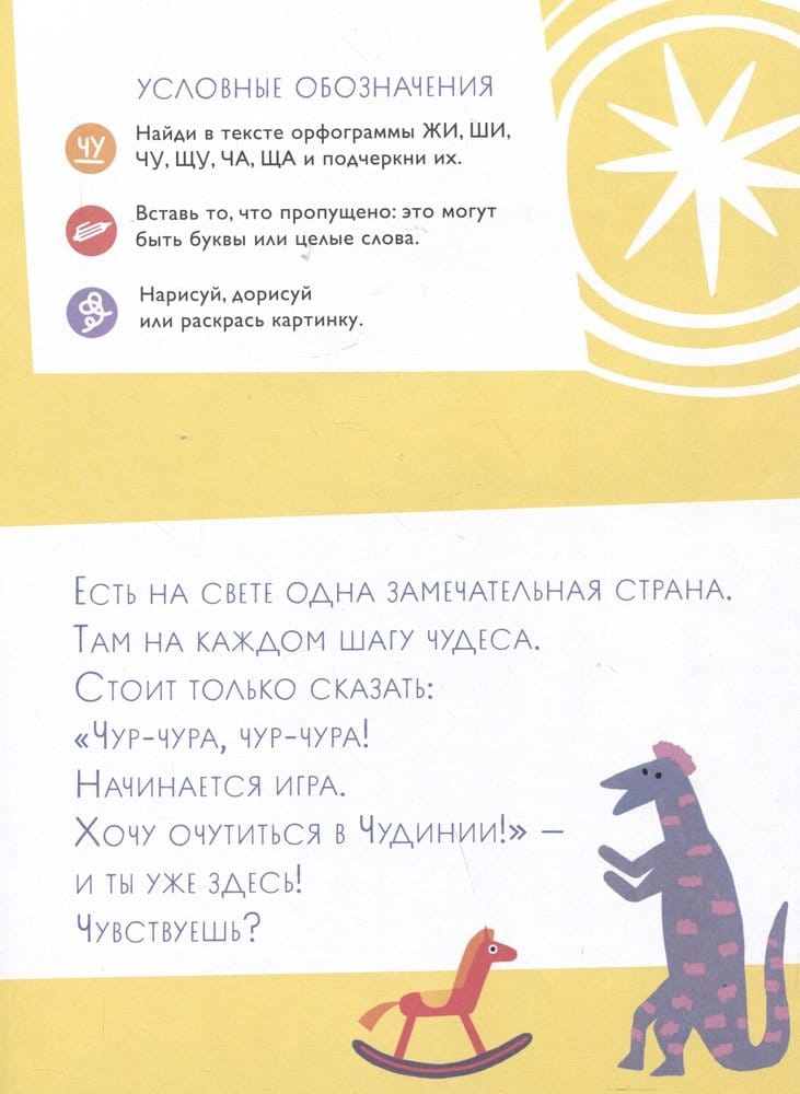 Как помочь своему младшекласснику запомнить и научиться применять правила правописания жи-ши, ча-ща и чу-щу? Как превратить урок русского языка в увлекательное приключение? Как не отбить у ребенка желание учиться? Поможет книга-рабочая тетрадь «Чудесное путешествие в Чудинию». Кандидат педагогических наук, писатель и журналист Марина Аромштам предлагает школьникам отправиться в сказочную Чудиню: страну, где живут милые чудинцы, приручившие чудовище, уважающие чай с чабрецом и ездящие на жирафах, которые питаются щавелем. Заметили, как часто повторяются гласные после шипящих? Читая историю чудинцев и выполняя задания, ребенок просто не сможет не запомнить эти орфограммы!